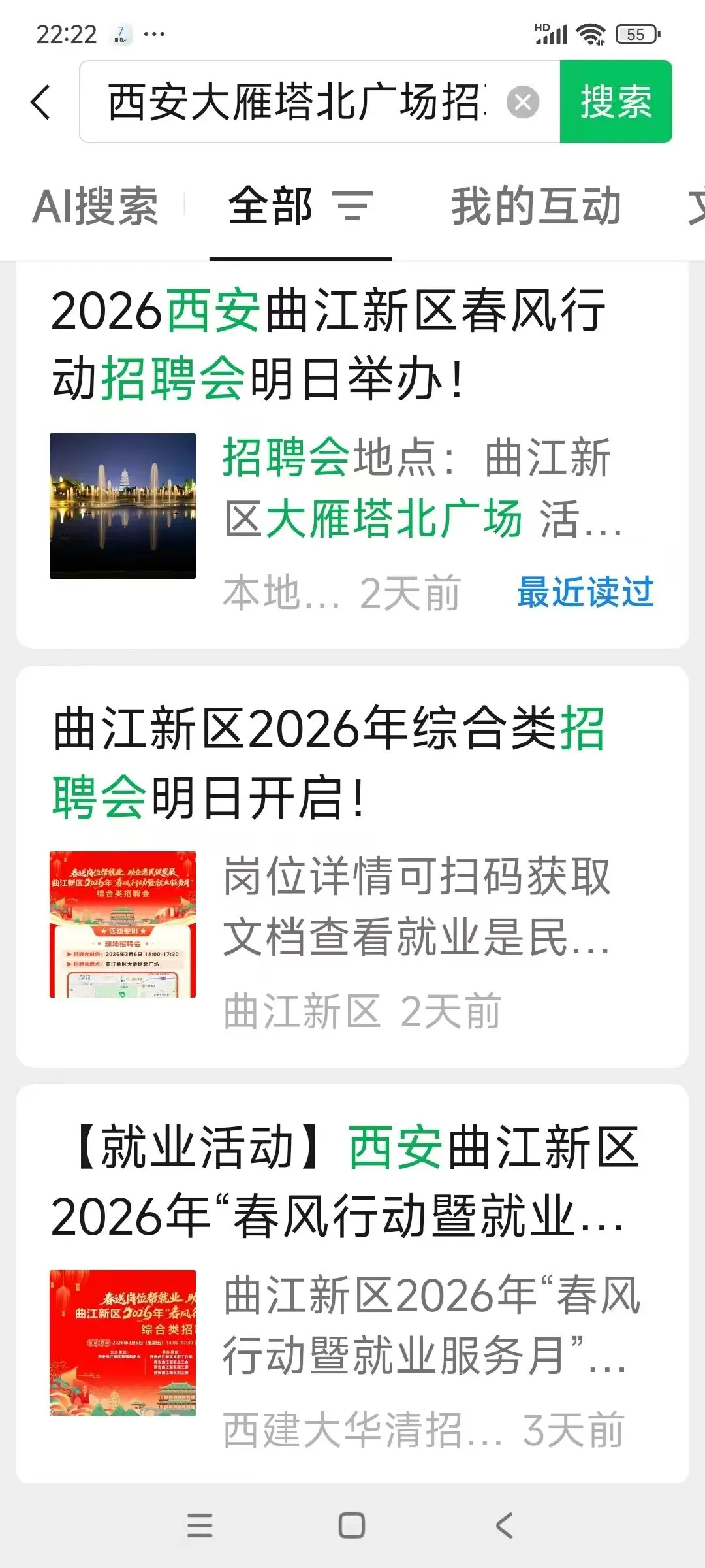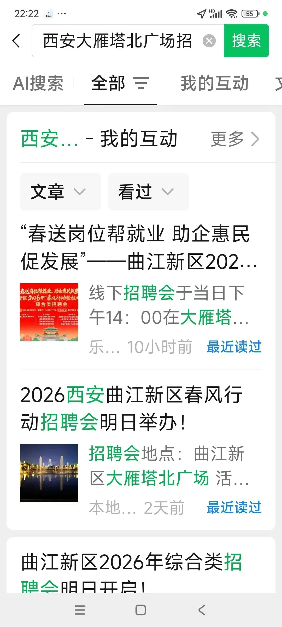 昨天上班跟同事说:“路过大雁塔北广场,看到好像有招聘会”。其中一个同事说:“它在某某上面看到了。” 其他好多同事都不知道大雁塔北广场有这个招聘会。今天在公众号搜一搜输入“西安大雁塔北广场招聘会”这几个词后,看到一些账号发布的相关内容,原来是曲江新区大唐不夜城西安建筑科技大学和陕西广电举办的2026春风行动招聘会。
