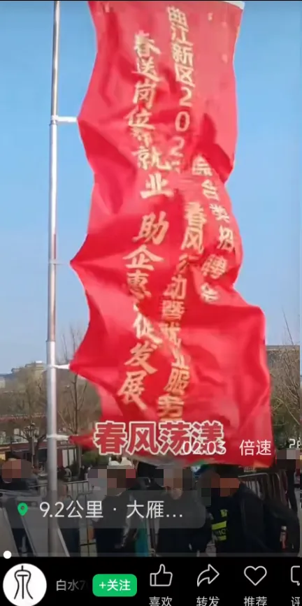 当下,旅游博主比较火爆,特别是出国游的旅游博主。这年过完了,新的一年开始总得谋划一下干点啥吧,去哪个城市呢?继续在国内卷还是出国呢?一些人觉得国内太卷了,于是选择出国。出国的话买机票住宿是一笔不小的费用,没口才没资金没学历,怎么出国呢?有些人选择徒步,视频发出后流量很大吸引不少人也想一起结伴出去,于是开始建群。如果选择跟搭子一起结伴出国旅游甚至徒步去欧洲的话,还是要谨慎。要是家里上有老下有小都需要你照顾,不建议冒这么大的风险。 昨天外出上班,车子快行驶到大雁塔北广场的时候,透过窗外看到好多红色的旗帜还有不少桌子。一看这种情景,脱口而出招聘会。车子越来越近,越看越像招聘会。昨天上班快迟到了,早上做了一些主业上的工作,匆匆忙忙去坐车外出上班有点晚了。要不然,就下车看究竟是不是招聘会了。