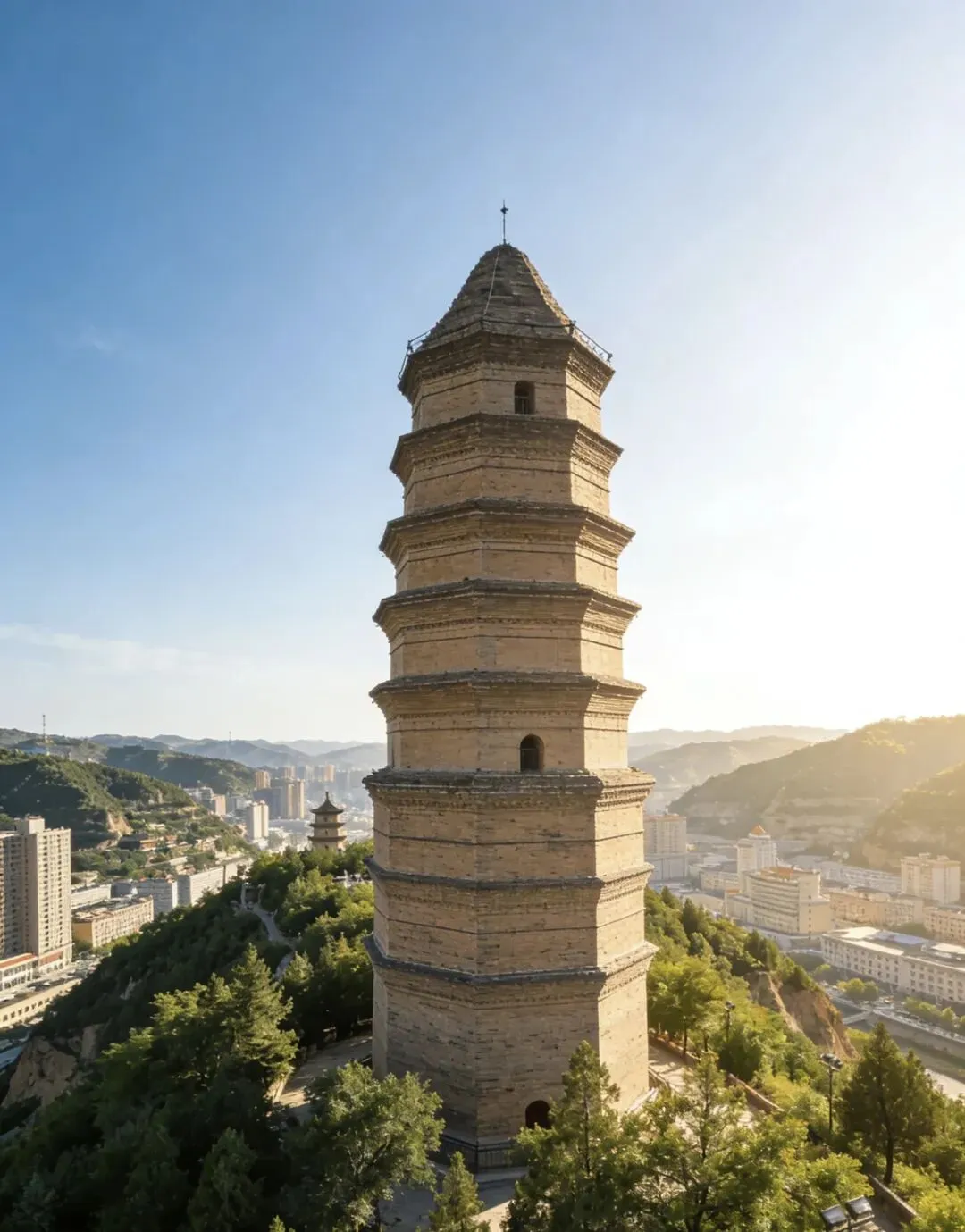 宝塔山在隋代称为丰林山,宋代改称嘉岭山,山顶的宝塔,原名岭山寺塔,始建于唐代大历年间(约公元766年至779年),北宋庆历年间(约公元1041至1048年)恢复重建。金大定九年(1169年)以塔为标志建寺庙,明神宗万历三十六年(1608年),在原塔倒后重建。