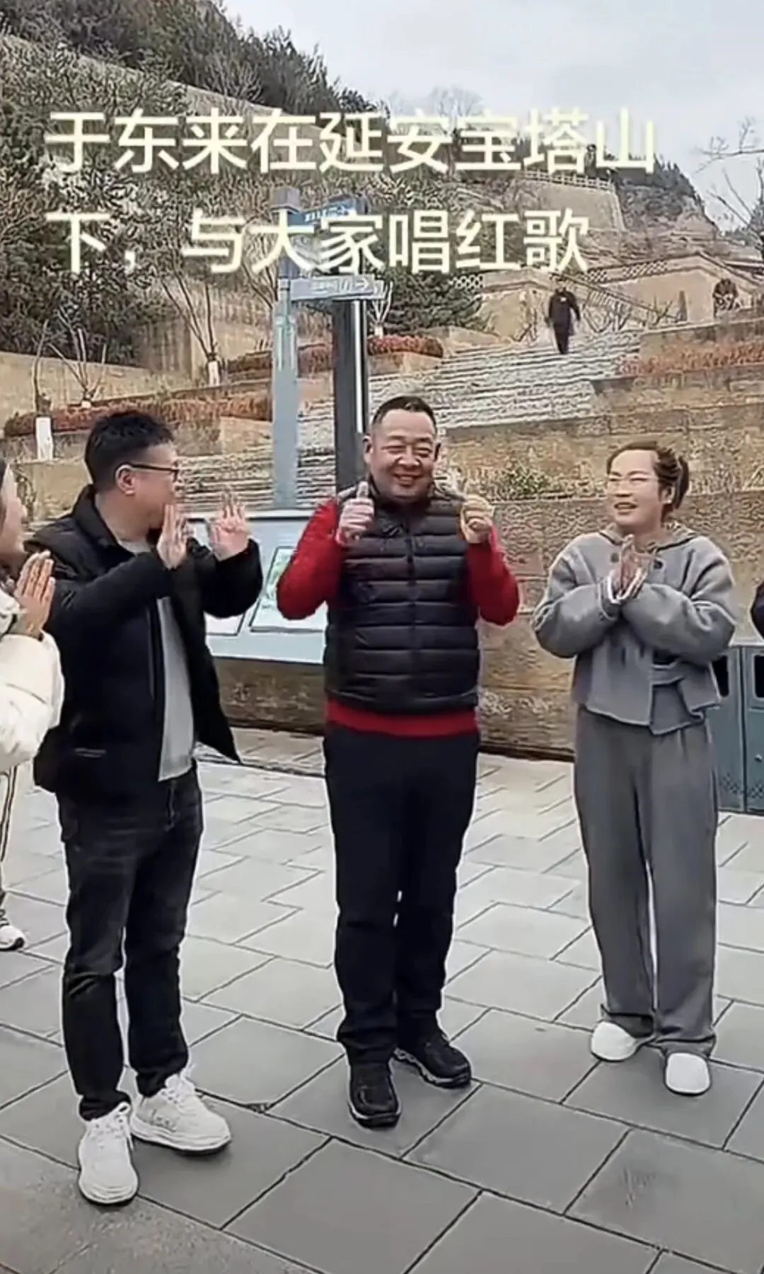 唱完歌,景区工作人员和于东来一起合影留恋,于东来也当景区宣传员说,欢迎大家来延安。