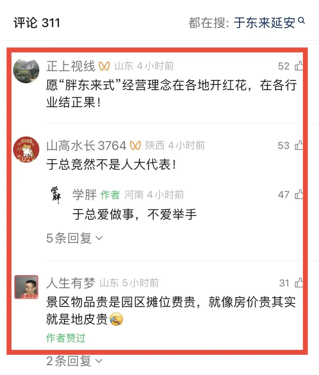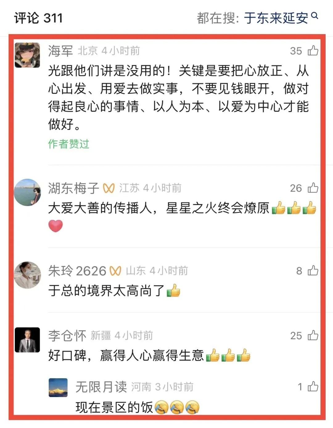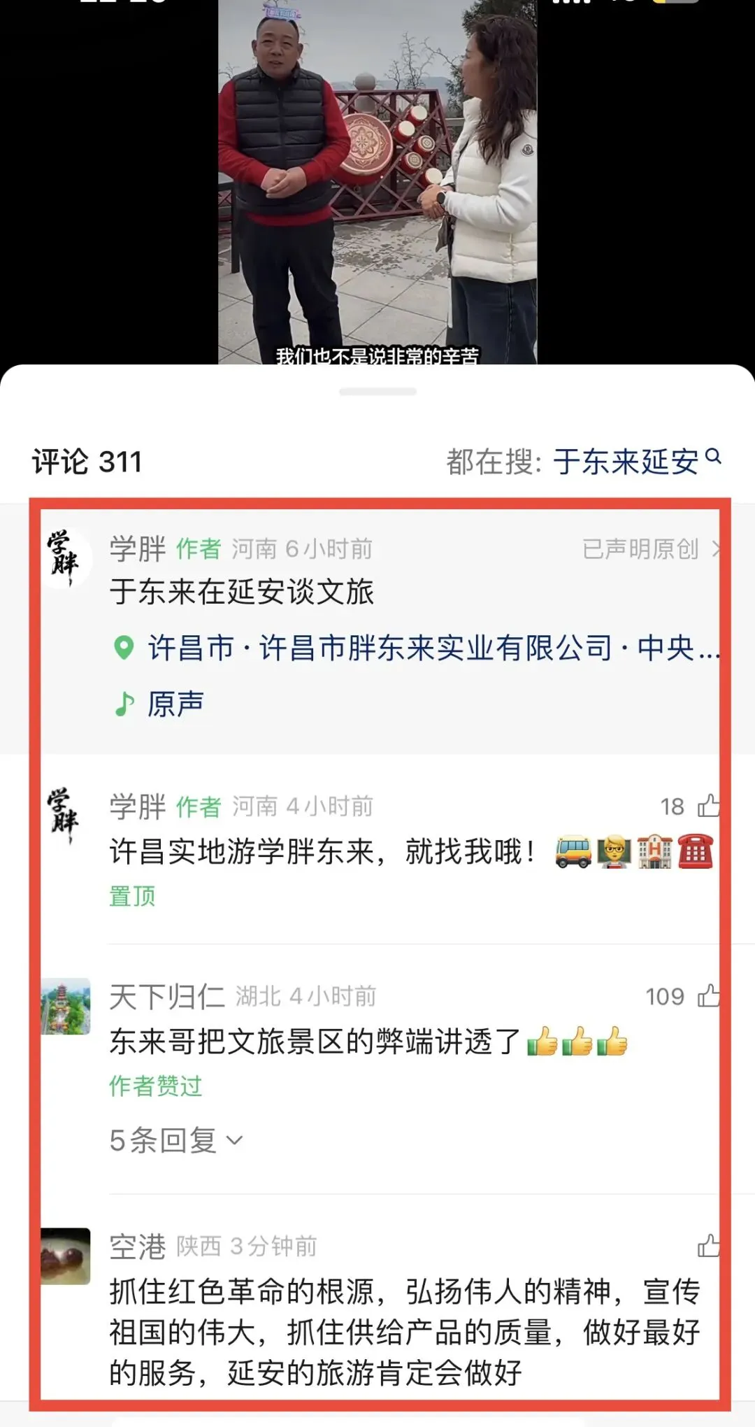 于东来接受了景区一个直播专访,这次于东来从三个角度谈了自己看法:(延安文旅应该做全国文旅标杆、景区平价购物、和工作人员游客一起唱红歌)。