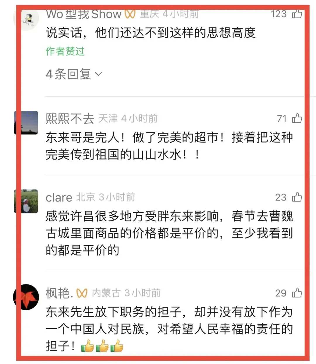 于东来说,他23年来领导胖东来这个企业走到今天,就是抱着这个信念创业走到今天,造福于人民。