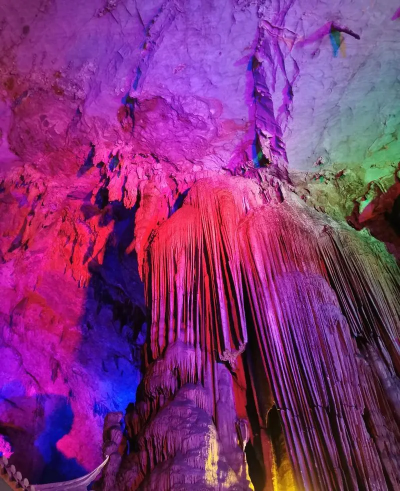 这个溶洞最特别的地方在于它是两层结构,上层是旱洞,下层是地下河,你走在上层的时候能听到下面水流的声音,但看不到水在哪,这种感觉很奇妙,就像是有一个平行世界在你脚下运转。然后你坐船进到地下河里,突然发现这个空间比你想象的大得多,河道蜿蜒曲折,两边是各种形态的钟乳石,而且因为是地下河,水温常年保持在16度左右,夏天进去瞬间凉快下来。