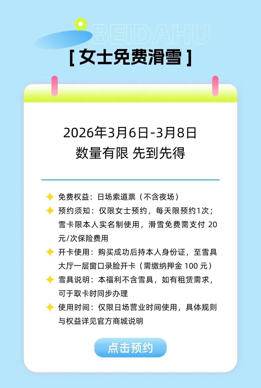 3月6日-8日,中旅松花湖度假区推出夜场滑雪票/夜场滑雪套票、日场滑雪票/日场滑雪套票,女士享半价福利,双人组队1人免单,平均每个人的滑行成本更低!