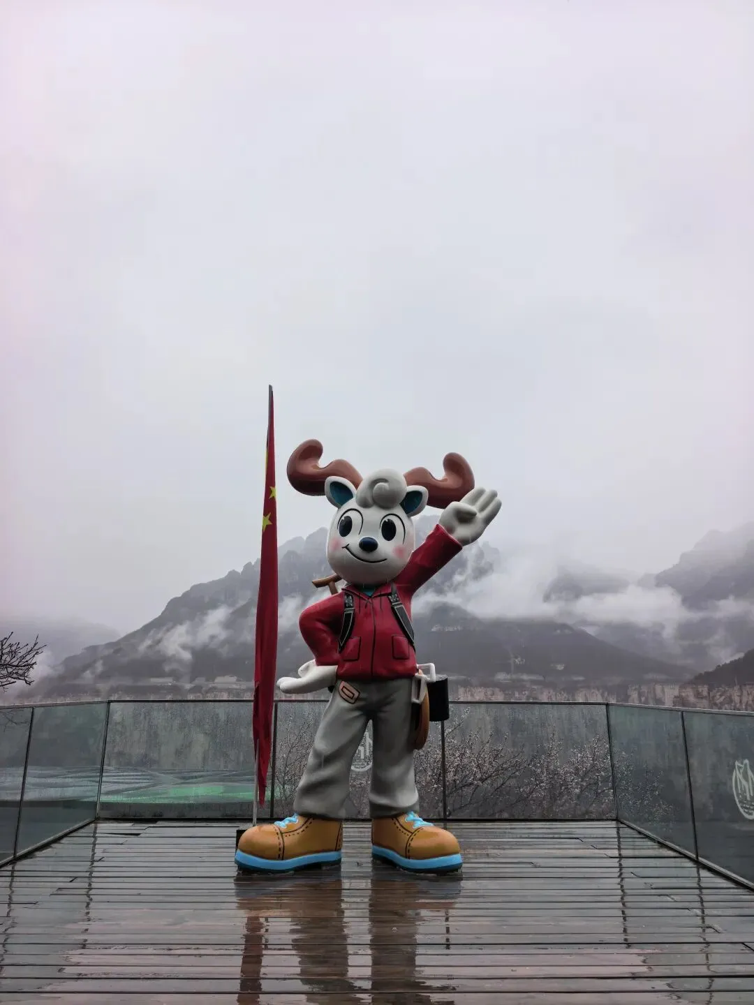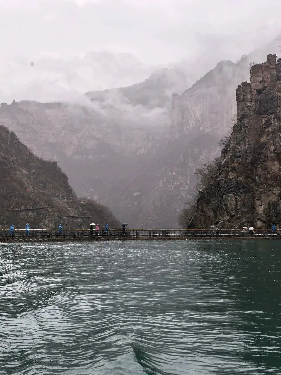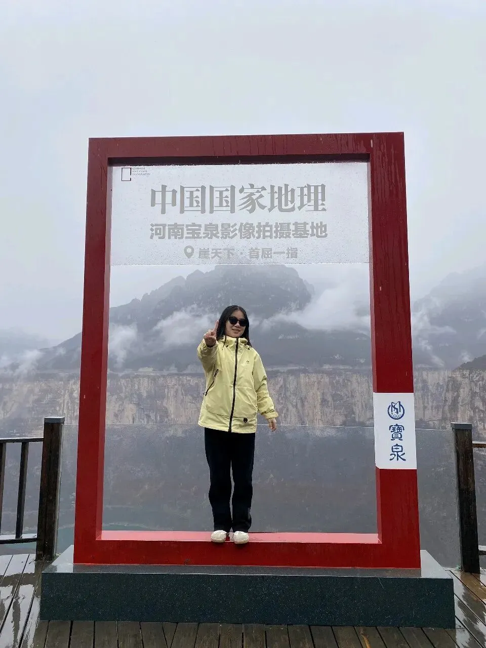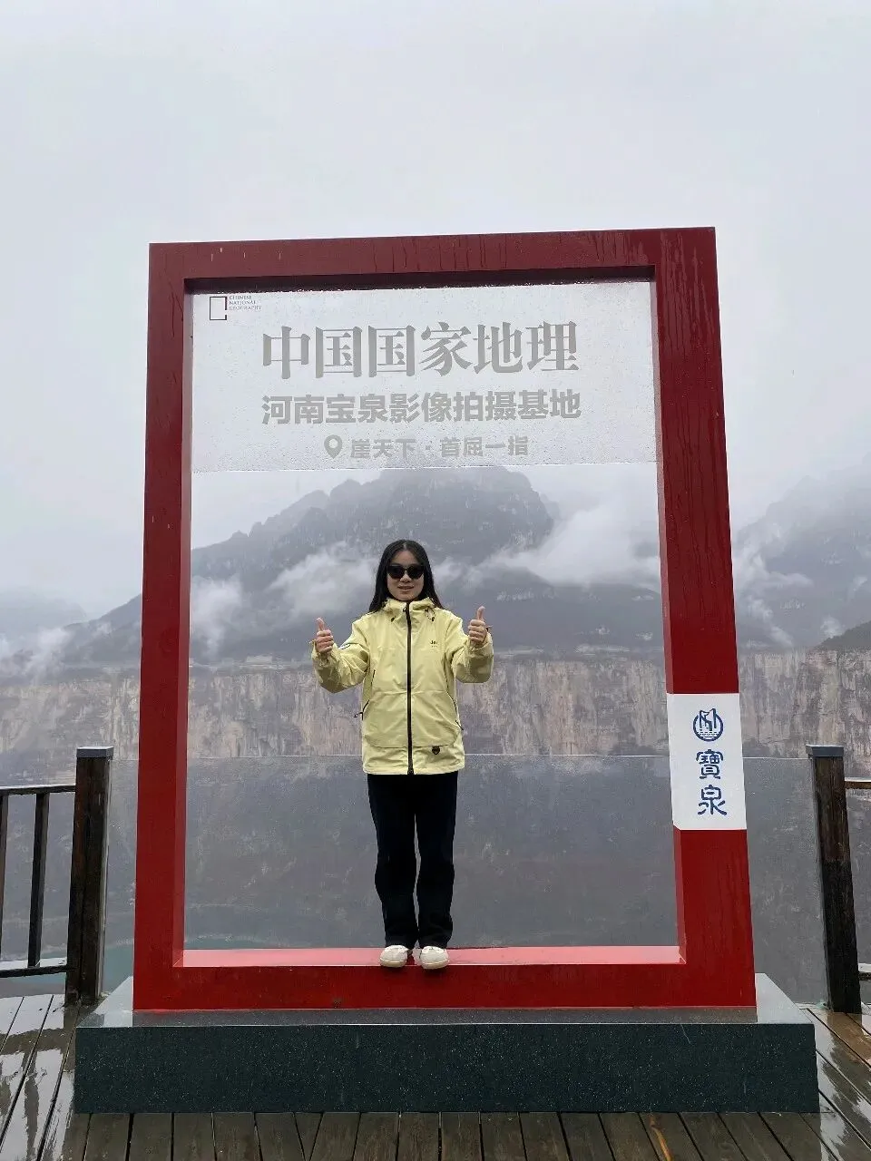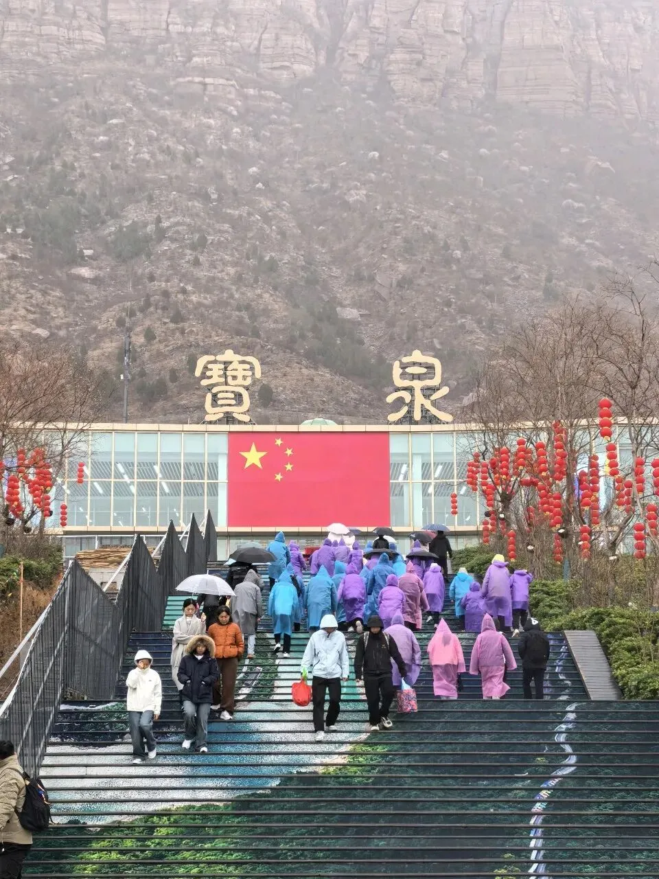 第二天一大早,差不多六点,我俩就被闹钟⏰叫起来,要洗漱收拾去赶旅游团的车了,上车点是胖东来附近。收拾的中途,有人在群里发消息问,外面下雨了,游玩还正常进行吗。我们这才发现外面下雨了,导游说车已经出发,按照购买原则,如果不去的话,就要损失80%的费用,然后又想着来都来了,既然能够正常出发,那就是可以正常爬山的,于是我俩就出门去楼下超市买了伞和雨衣,赶往上车点。