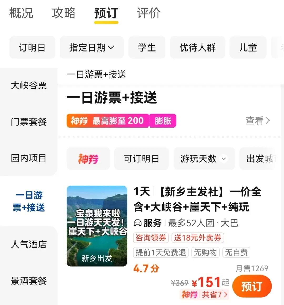 当时决定好已经十点半左右,我们又在美团上搜索新乡宝泉旅游景区的门票,看到有一个旅游团,管接管送+门票。我们就打电话咨询,门票是否包含接驳车+下山索道,正好卡着人家23:00下班的点打过去,大哥的态度很好,很详细且耐心的回复了我们的问题,于是我们先定了宝泉旅游区的票。