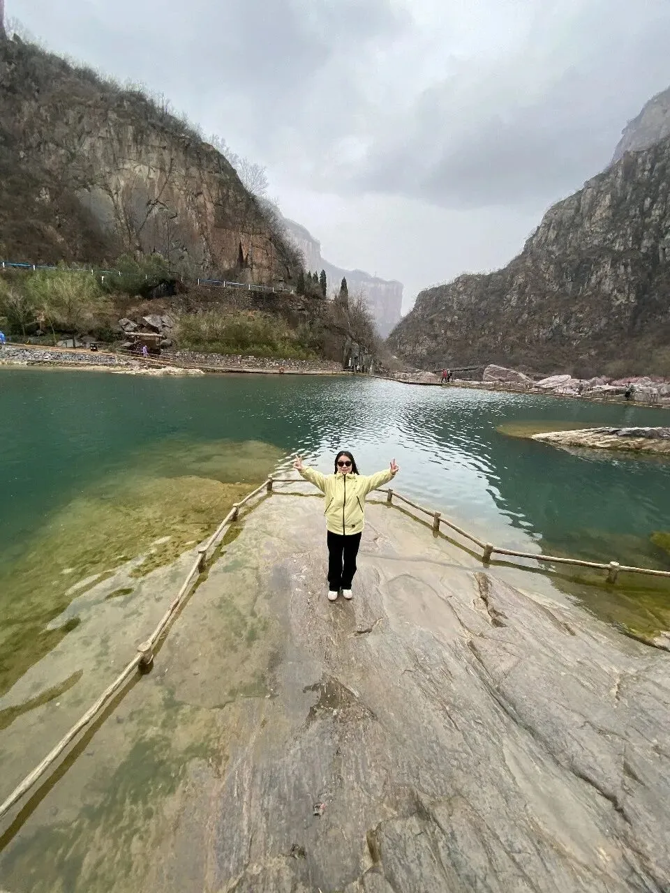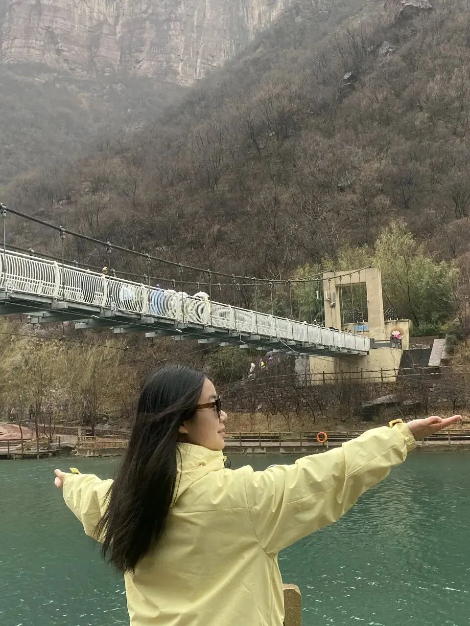 继续往前走,是一座桥,我们在桥下拍了照片。此时我的头发还是顺滑蓬松飘逸,看起来很好的样子。