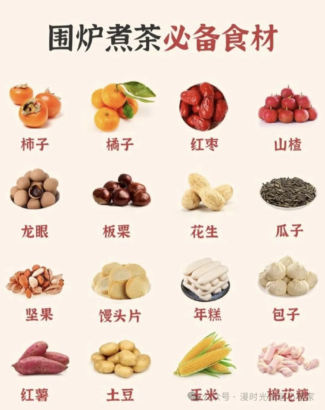 今天我们在围炉煮茶之余,还会烤上柿子、桂圆、沙糖桔、年糕、红薯、棉花糖等瓜果零食。