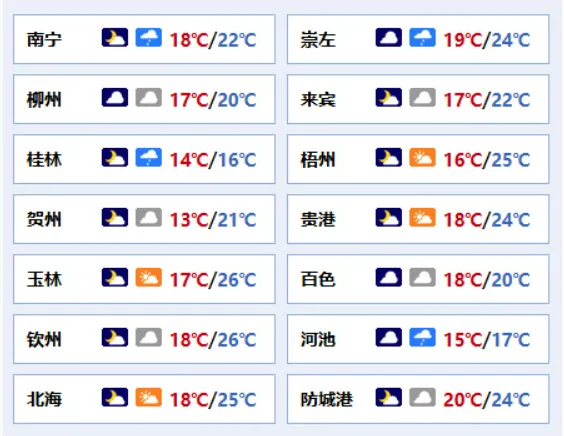 南宁市:多云转阴天有小雨,东南风2级,最低气温18℃,最高气温22℃。