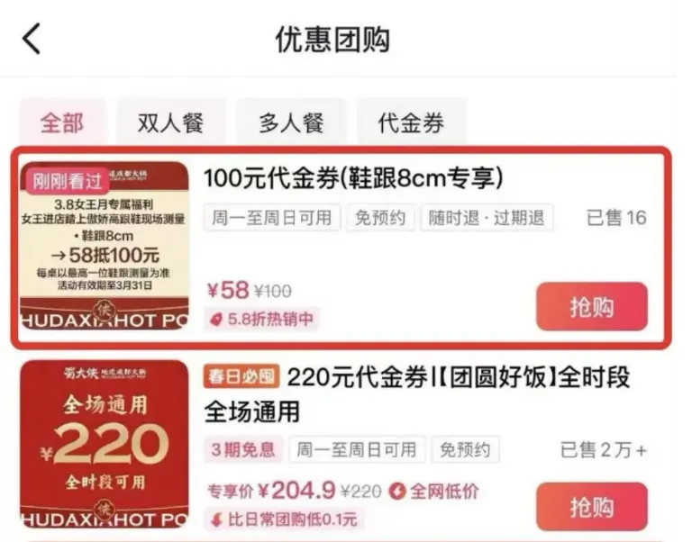 近日,连锁火锅品牌蜀大侠一门店推出“3·8女王月专属福利”,女生进店现场测量鞋跟达到8cm的,即可在活动日期内使用“58元抵100元”代金券。该活动遭到网友吐槽。3月6日,蜀大侠相关负责人回应,已要求涉事门店下架相关活动套餐。【详讯】