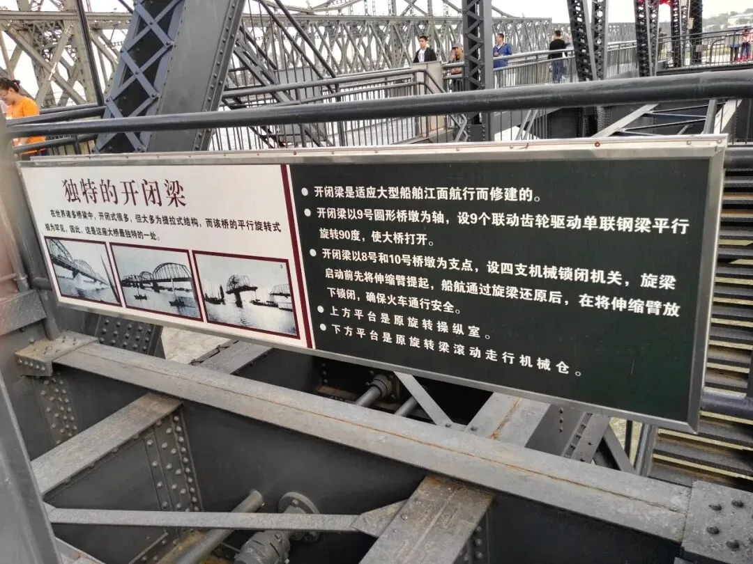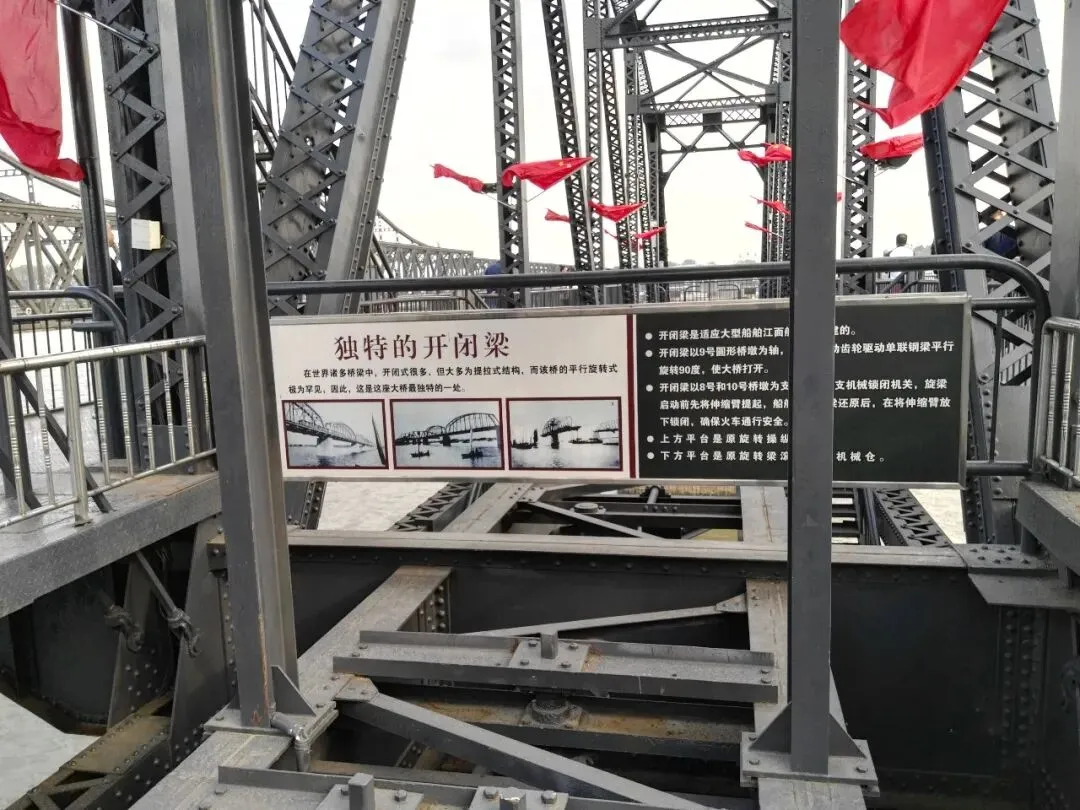 断桥中间有一处围蔽处,有图片介绍独特的开闭梁技术。大意是说,鸭绿江断桥的第四孔,就是旋转式“开闭梁”所在,它由4个主动齿轮驱动被动齿轮,以中心圆墩为轴转动,启动时可旋转90度,每转动一次需20分钟。这样,大型船只便可顺利地穿行而过,起到了保证铁路和航运畅通的作用。