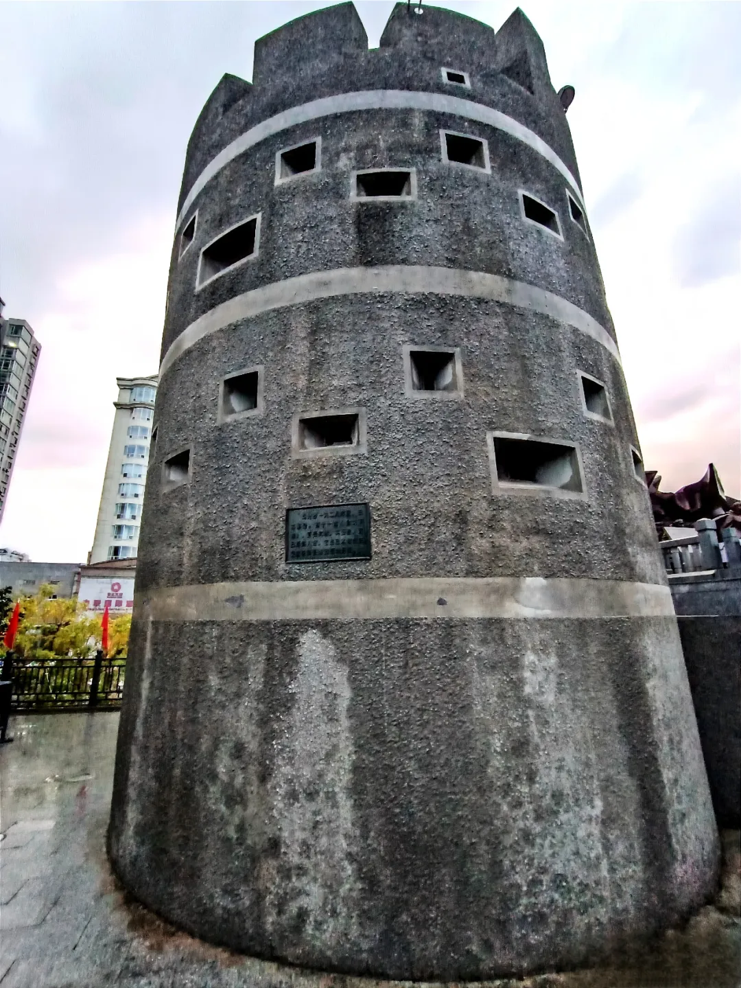 景点入口处为断桥桥头,桥头竖立着一座1928年修建的直径6米、通高11米的炮楼。炮楼外表是用宽厚石料砌成的墙体,炮楼内部建筑包括地上四层和地下一层,看起来十分坚固,足以挡住任何攻击。炮楼是当年日本警备队守桥的主要工事,为了防范抗联部队的破坏,日本人对鸭绿江桥的守卫相当森严。炮楼是日本帝国主义掠夺和侵略我国的见证。