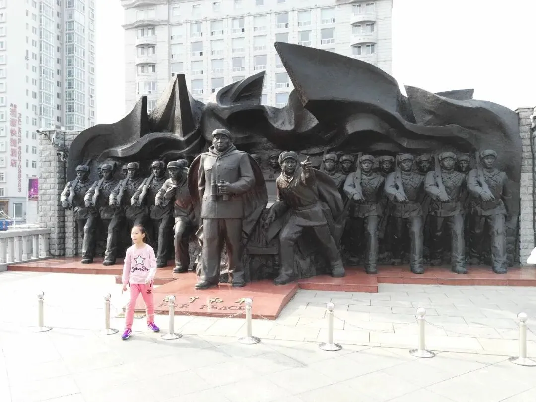 从平台再拾级而上就是断桥。断桥正面首先看到的是一组巨幅雕塑《为了和平》,是彭德怀将军与众将士过江纪念雕像。是根据1950年10月19日彭将军率军过江的真实历史、真实人物雕塑的。雕像很震撼,充分展现出中国人民志愿军雄赳赳、气昂昂、跨过鸭绿江、保家卫国出征的那种英勇气势。中国人民志愿军用鲜血和生命换来了今天来之不易的和平安定生活。
