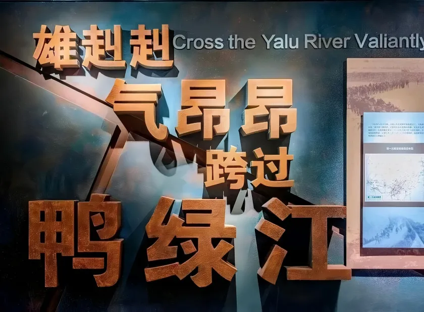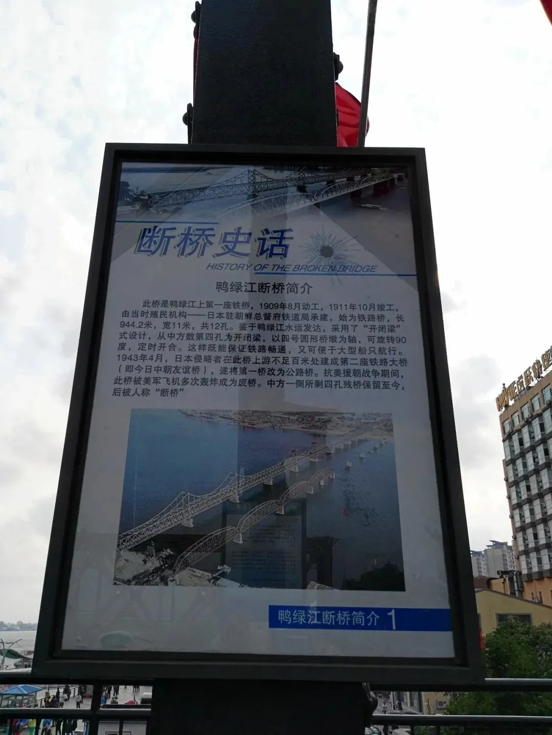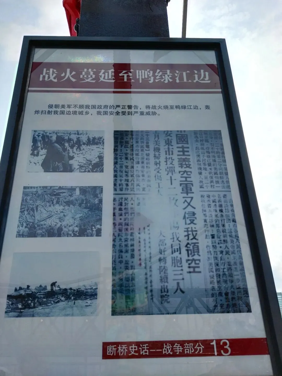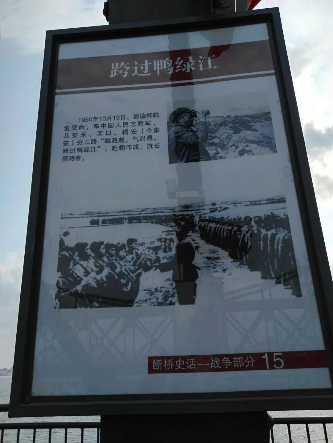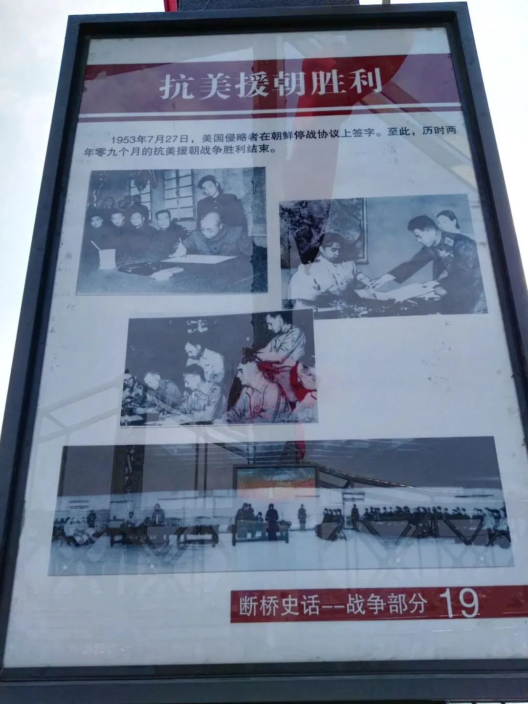 走在断桥上,断桥的桥柱上挂着不少介绍抗美援朝战争的画面。
