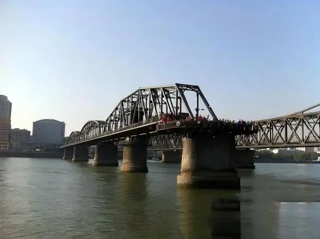 1910年4月,朝方的工程已经过半,腐败的清政府在日本人的强压下,不得不同意他们在中方一侧建桥。因此,1910年5月在安东(今丹东)进行施工,次年10月大桥建成通车,这便是鸭绿江上的第一桥。桥长944.2米,宽11米,共12孔,其中第四孔为可旋转90度的开闭梁结构,便于大型船只通行。日寇掠夺中国的大批物资就是通过这座桥运走的。