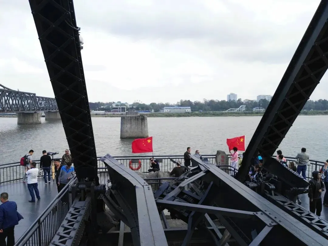 断桥尽头设有观景台,可眺望中朝两岸风光以及下游的中朝友谊桥(第二座鸭绿江大桥),看到的景色也是别具一格。一边是中国丹东市,一边是朝鲜第四大城市新义州市。祖国的繁荣昌盛历历在目,望着迎风飘扬的五星红旗,顿时觉得庄严而坚定,心中充满了敬畏和敬佩。