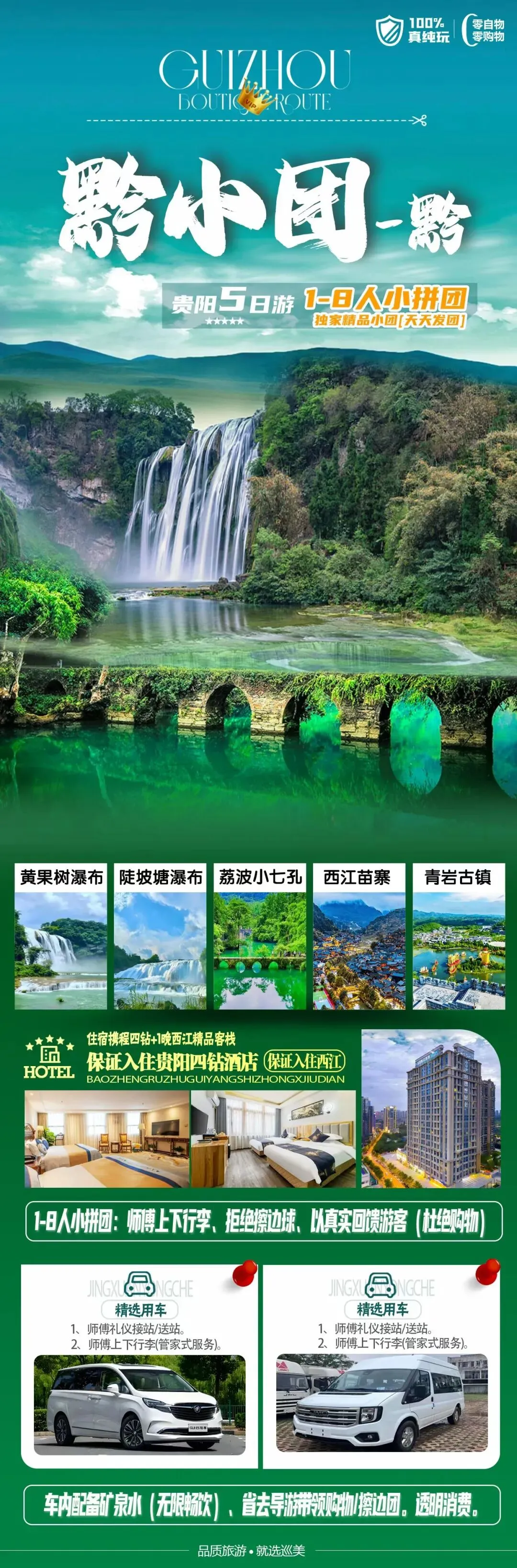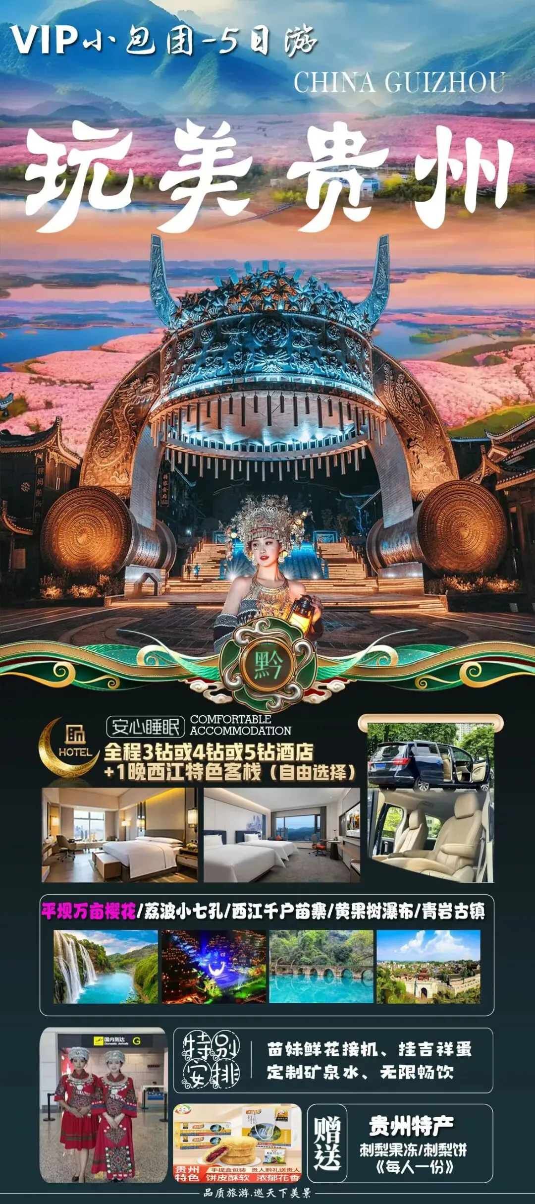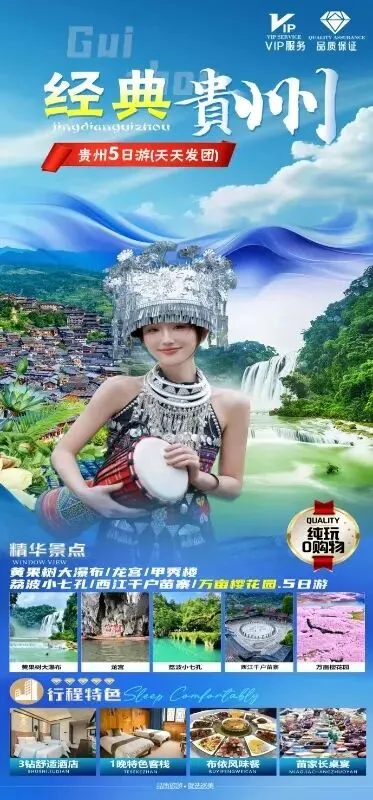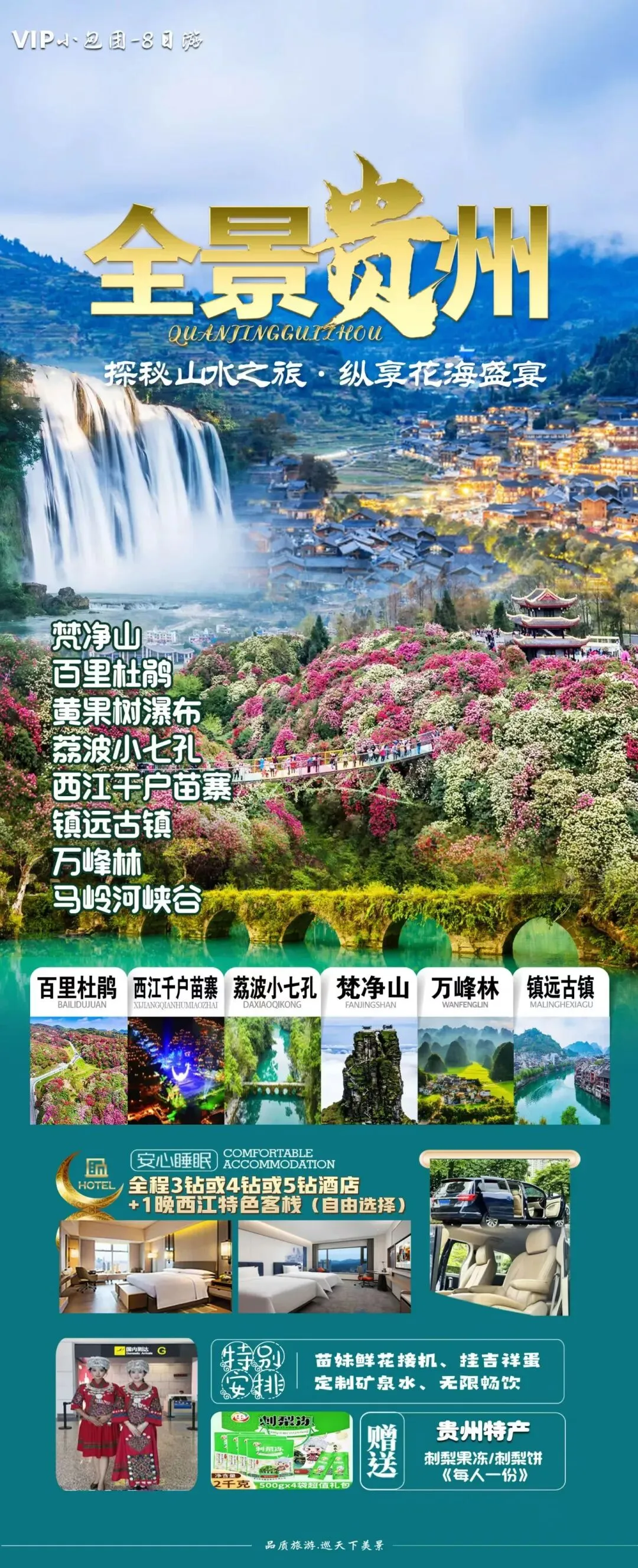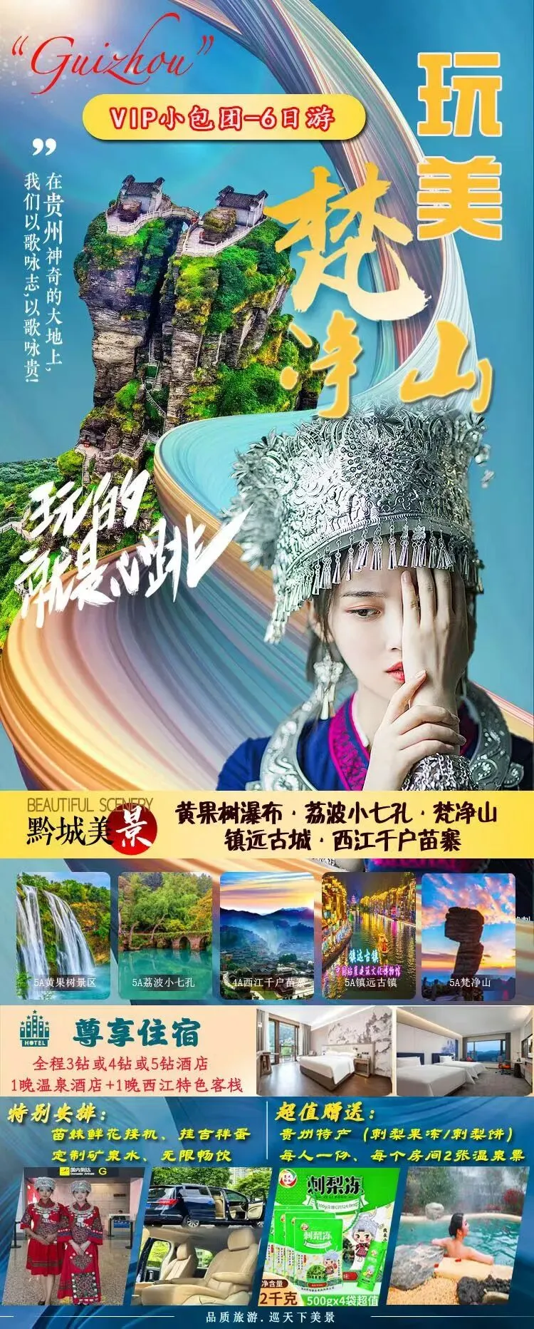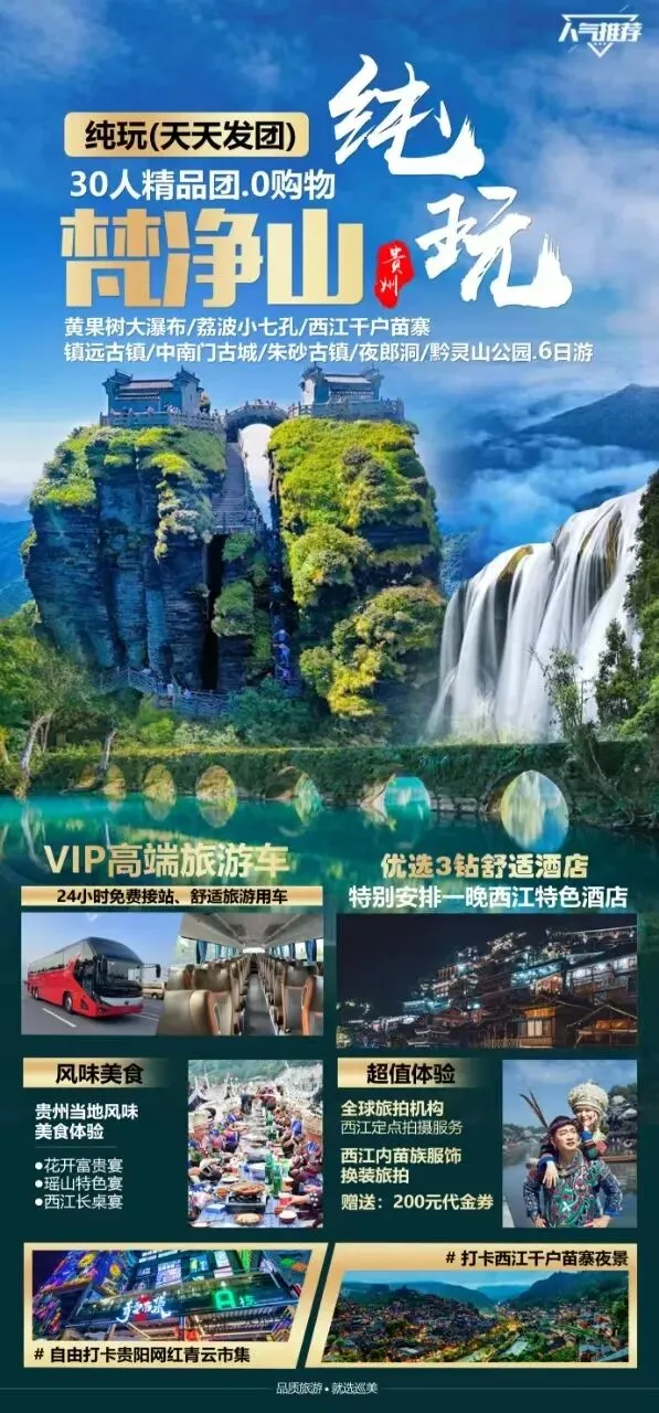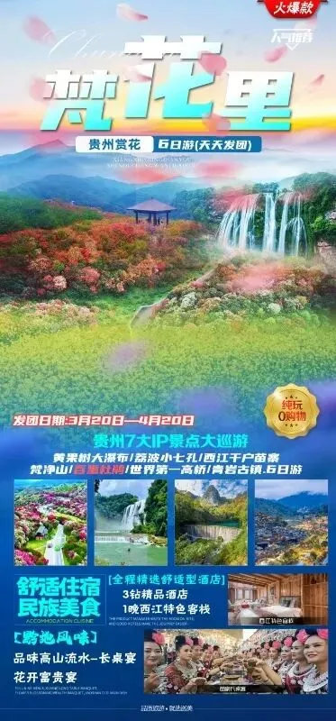 【0购物】贵州9大旅游路线(天天发团):梵净山、镇远古镇、平坝樱花、黄果树大瀑布、龙宫、江西千户苗寨、百里杜鹃、青岩古镇等