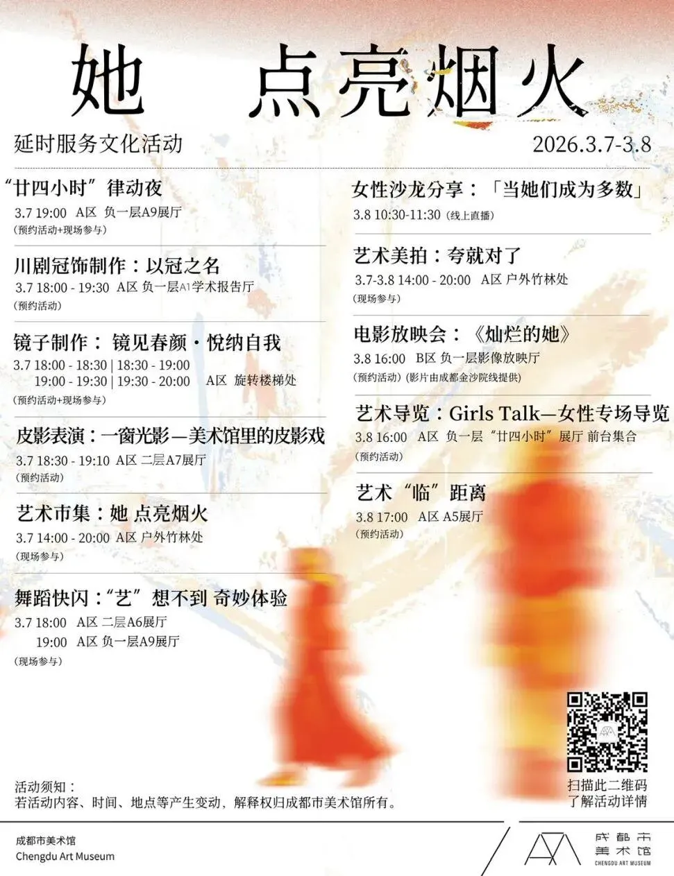 3月7日至8日,成都市美术馆活动内容涵盖线上女性主题沙龙、律动之夜、皮影戏、川剧冠饰手作、舞蹈快闪、女性专场导览、艺术市集、电影放映等多元活动,展现女性风采与艺术魅力。欢迎来现场共赏多元艺术盛宴,见证专属女性的独特力量!