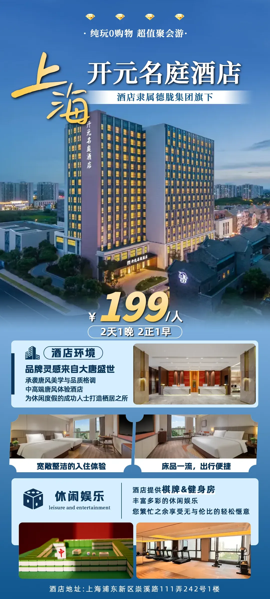 新开业酒店,浦东旅游度假区【开元名庭酒店】仅需199元每人2正1早!地铁站免费接送!免费棋牌&健身房!紧邻迪士尼乐园!