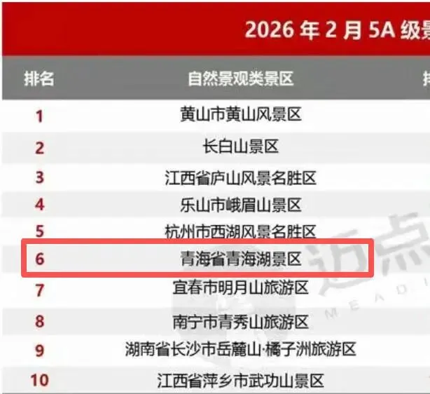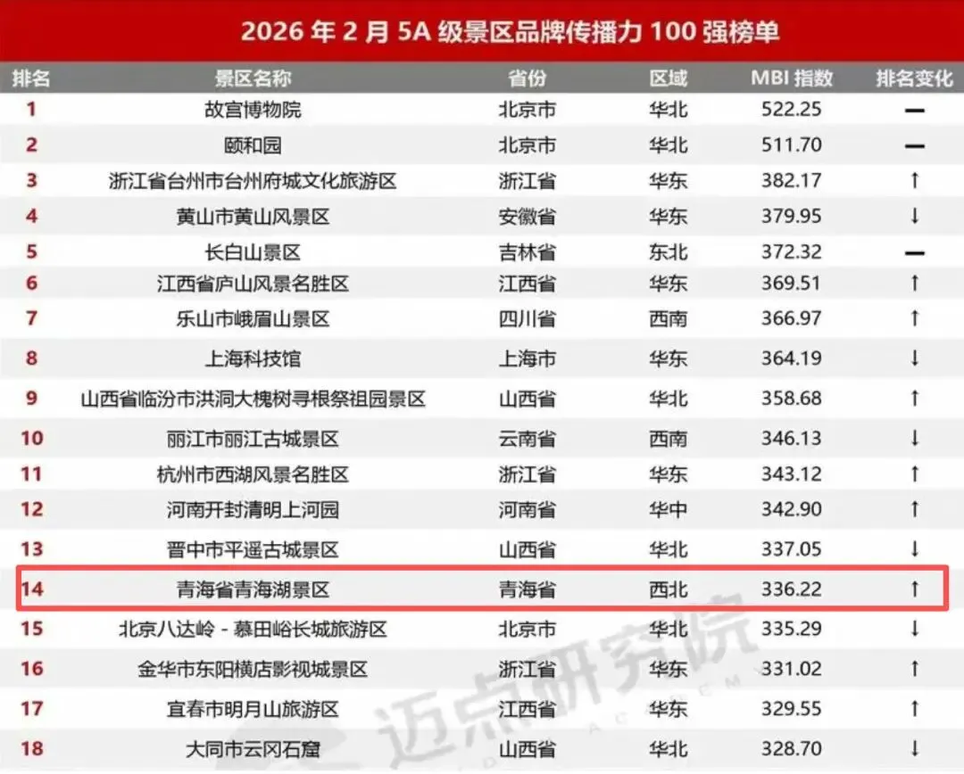 近日,迈点研究院发布的2026年2月全国5A级景区品牌传播力百强榜单,青海湖景区凭借冬季独特的蓝冰奇观,以冰裂、冰泡、冰柱等自然盛景搭配沉浸式观赏体验,跃升至全国第十四位,稳居西北地区首位、自然景区类全国第六,品牌影响力与行业竞争力显著提升。