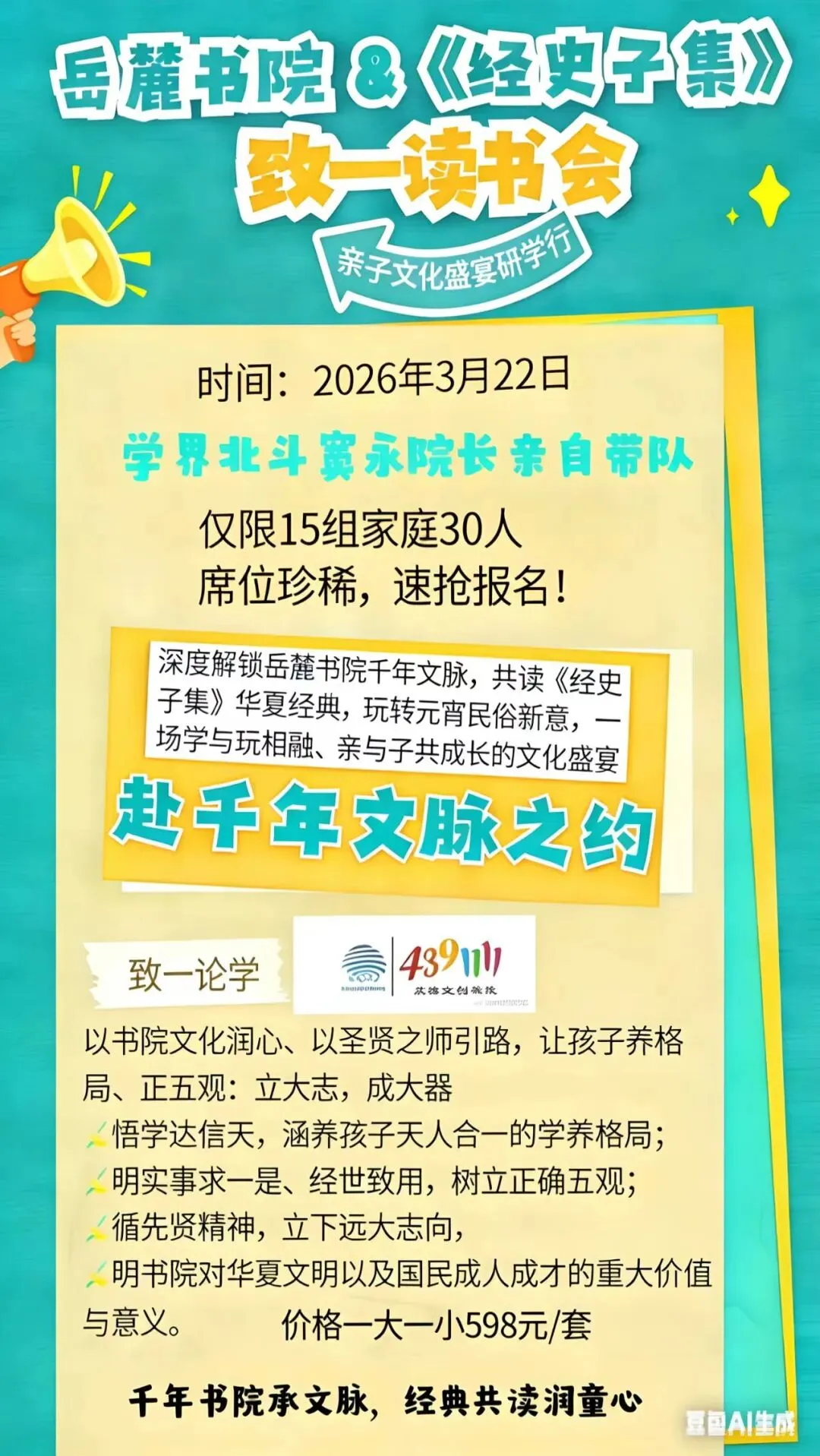 【春秋旅游】赴千年文脉之约·立少年家国之志 岳麓书院&《经史子集》致一读书会亲子研学一日游活动