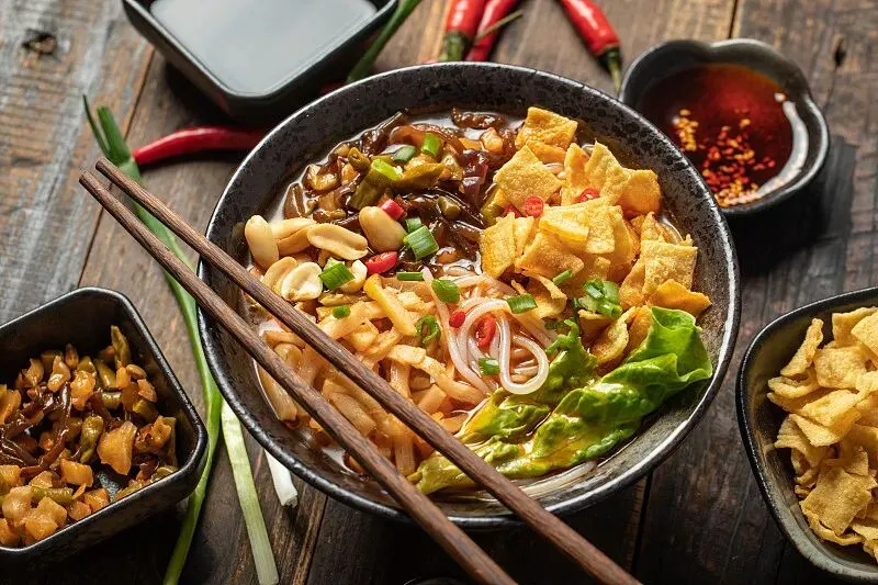 - 五色糯米饭、油茶、酸嘢、螺蛳粉、苗家腊肉、长桌宴
