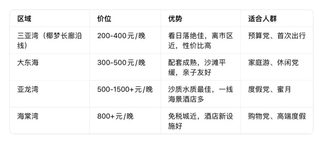 住宿分区推荐三亚湾、大东海、亚龙湾和海棠湾。