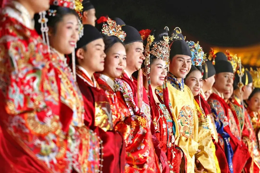 4.举办“华夏汉婚”集体婚礼,新人们着华夏霓裳,承千年古礼,完成一场关于爱与祈福的浪漫典仪。