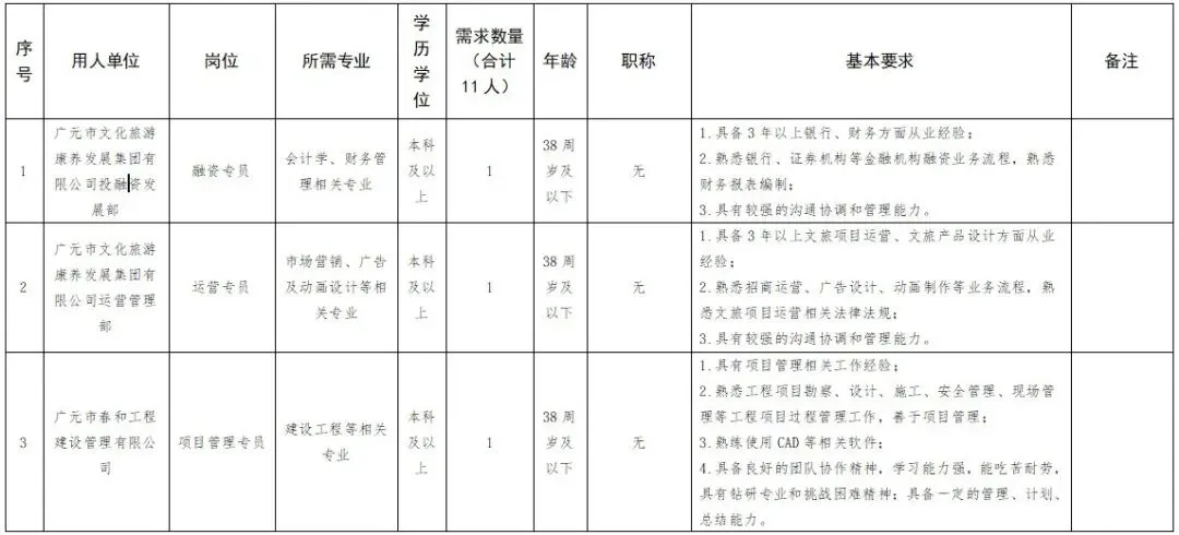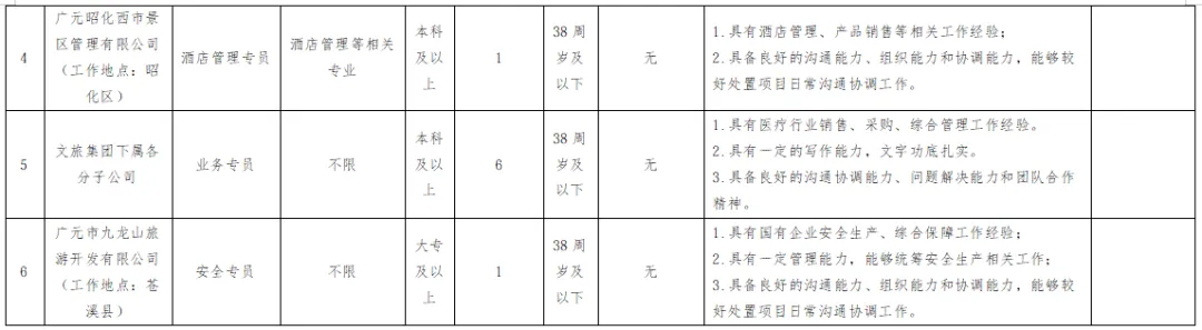 1.年龄、学历、专业等其他资格条件要求详见《广元市文化旅游康养发展集团有限公司招聘计划表》(附件1)。