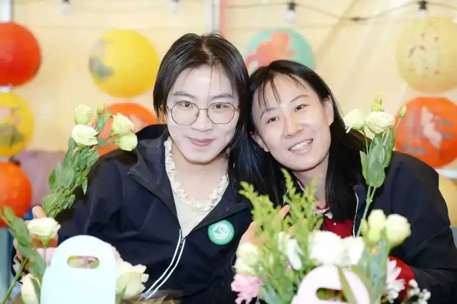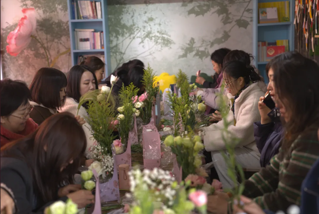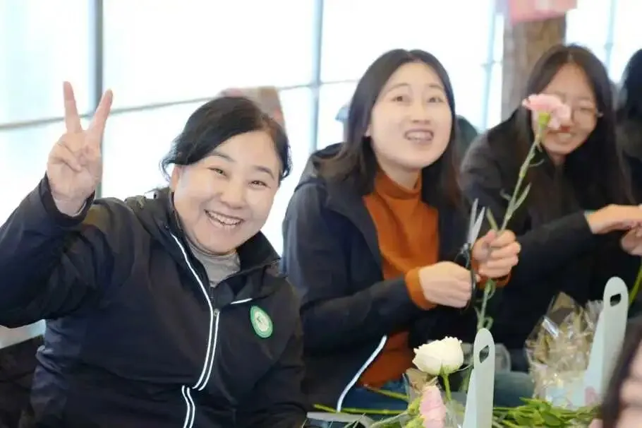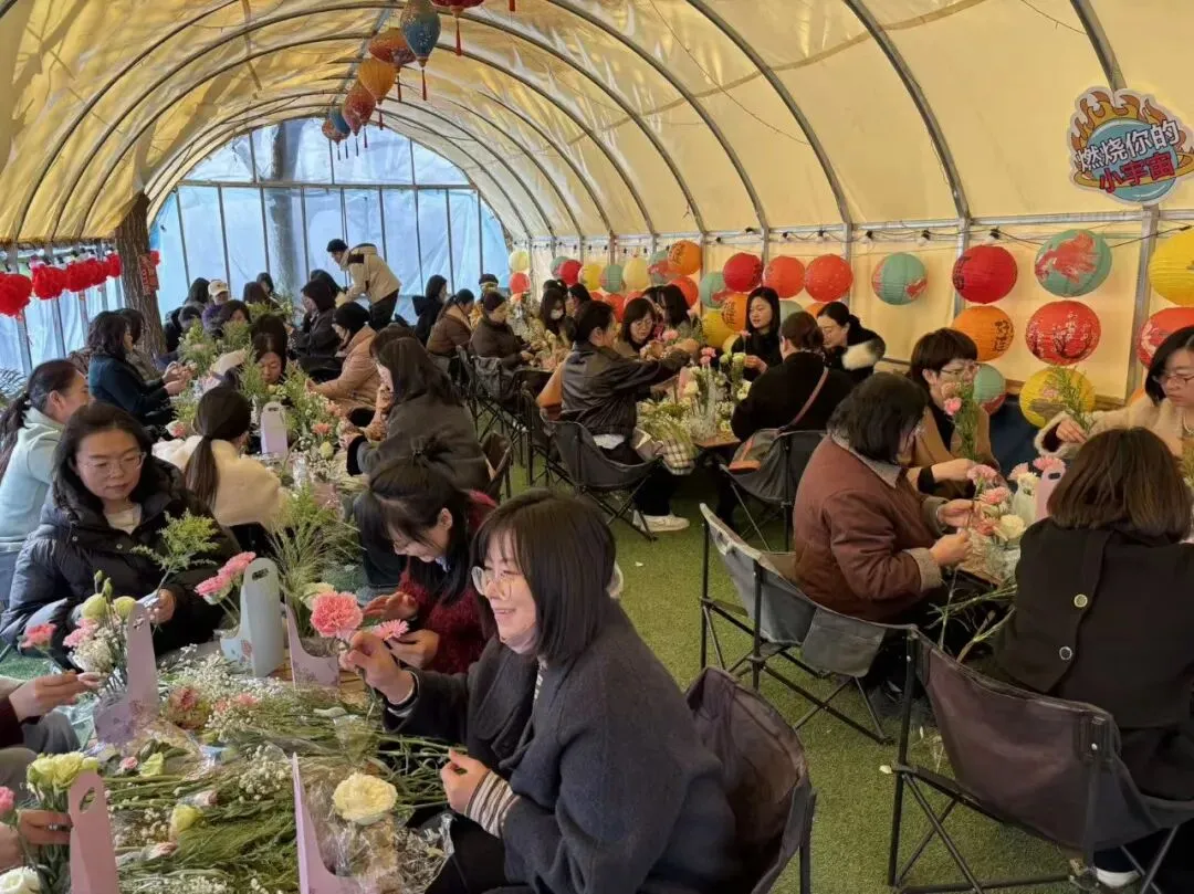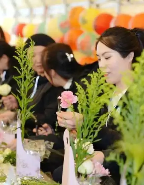 花艺师从选花、配色、造型等方面进行现场指导,大家边听边学,边学边做。不一会儿,一篮篮错落有致、生机盎然的插花作品便呈现在眼前。有的清新淡雅,有的热烈奔放,每一篮都承载着制作者的美好心意。刚刚体验过汉服的姐妹们,身着古装穿梭在花间,衣袂与花枝共舞,成为营地最亮丽的风景。