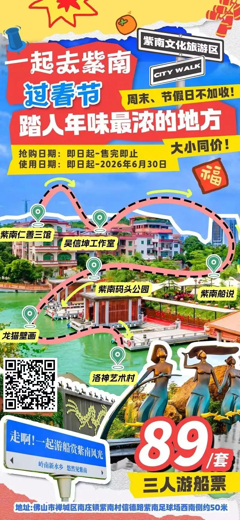 89元禅城紫南文化旅游区三人游船票,大小同价,周末假日不加收