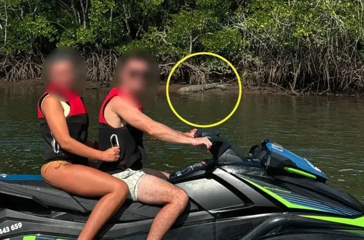 游客坐在摩托艇上,和五米外的鳄鱼“零距离接触”,照片中笑容满面的游客背后,竟然隐约可见一条巨大的鳄鱼……