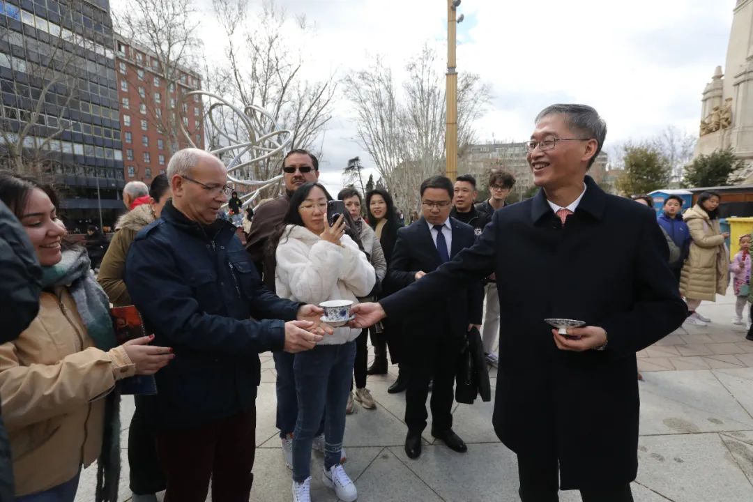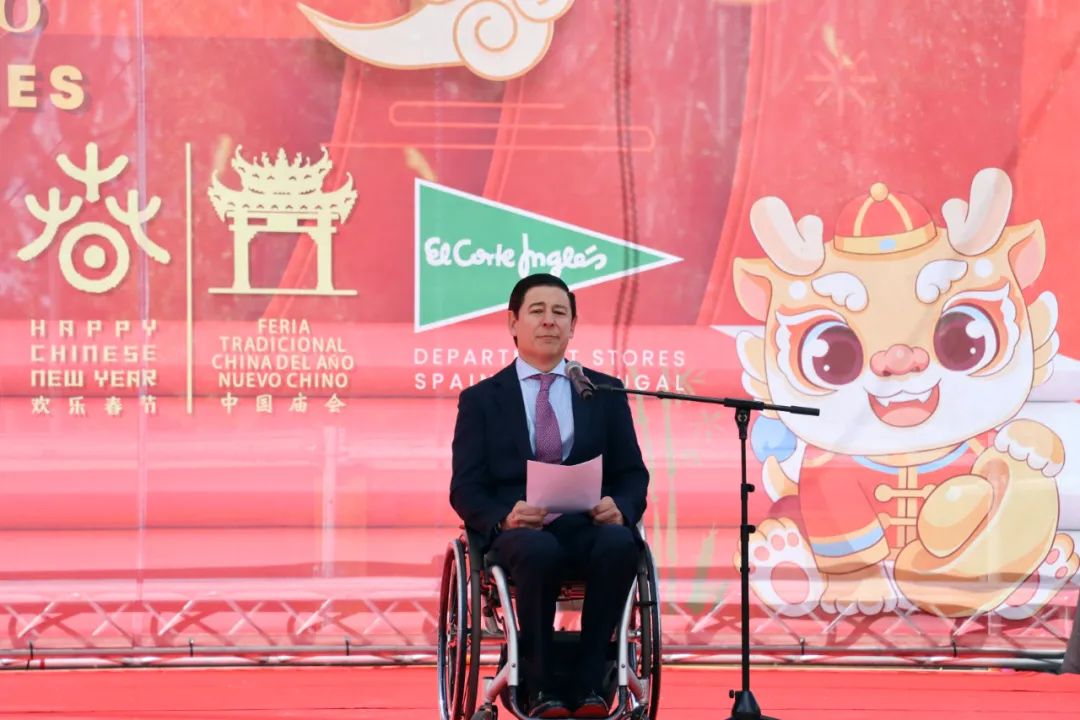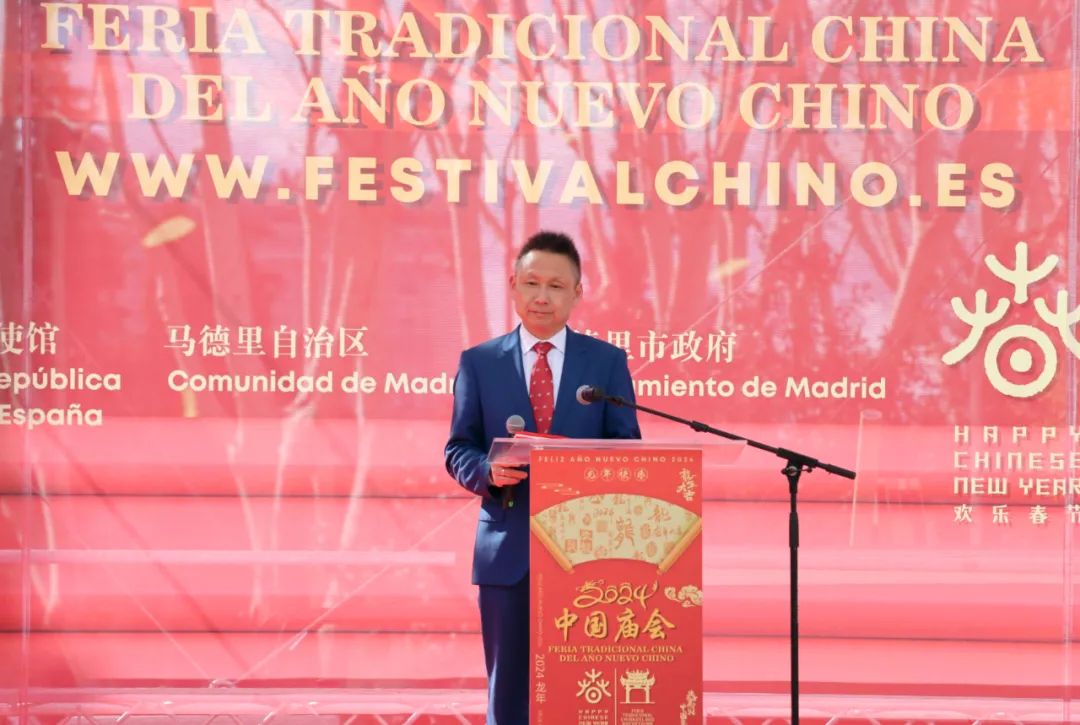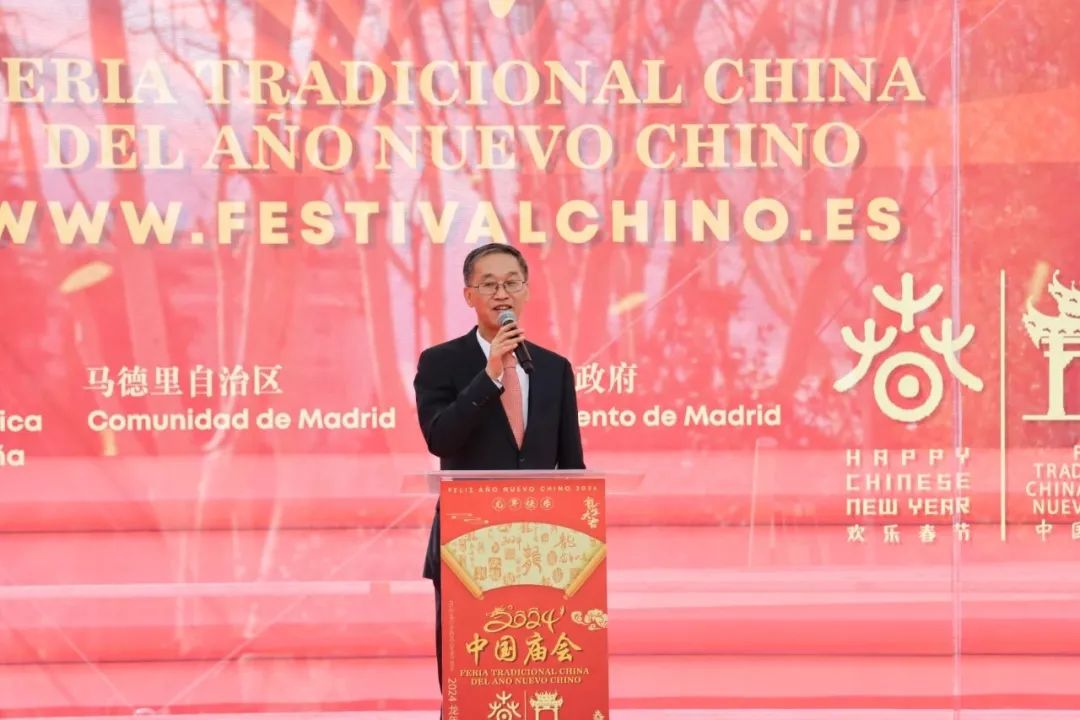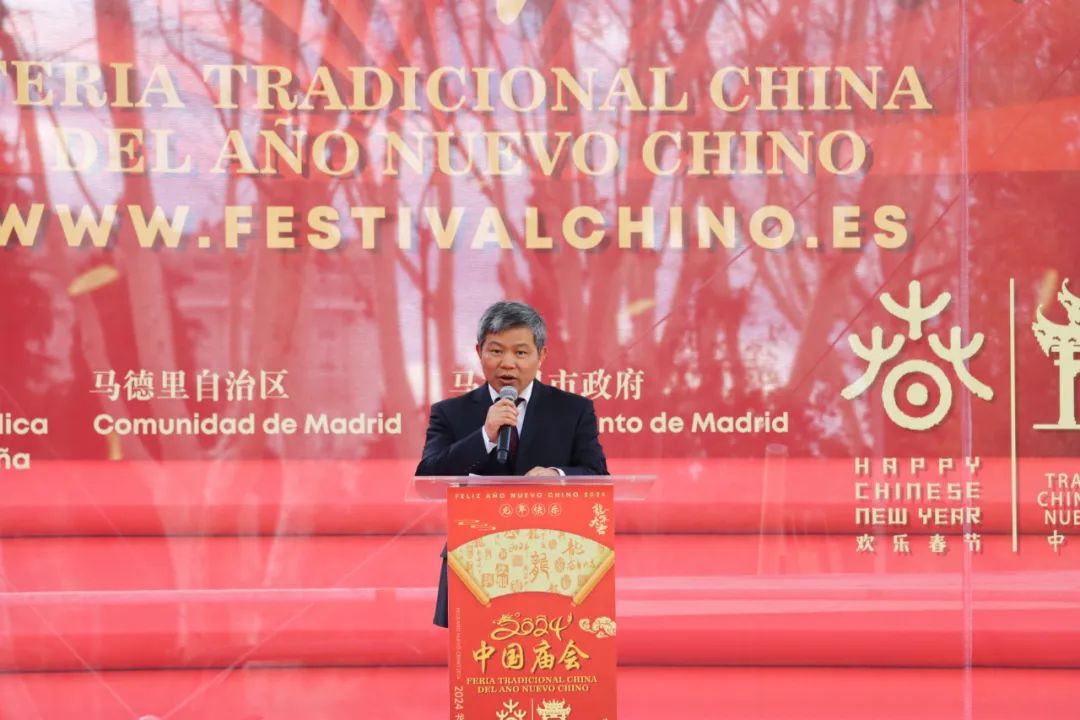 姚敬大使首先对广大旅西侨胞和西班牙各界朋友逛庙会、赏民俗、品美食、观歌舞,感受中华传统文化魅力,分享新春佳节的快乐与喜悦表达了欢迎。也特别提到,中国四川省的文艺工作者将不远万里专程来西,带来川剧、变脸、变脸和功夫茶等节目,给西班牙的龙年新春增添一道靓丽的风景线。强调了中西两国的悠久历史和丰富文化遗产,在人类文明发展的历史长河中,中西文明交相辉映、相互吸引,是文明交流互鉴、共同发展的典范。希望在未来在文化、经济等各领域交流合作不断深化拓展,促进两国民间交往和加深人民友谊。最后,姚敬大使代表中国驻西班牙大使馆向各位朋友致以最诚挚的祝福,祝愿大家新春快乐、阖家安康,龙马精神、大吉大利!