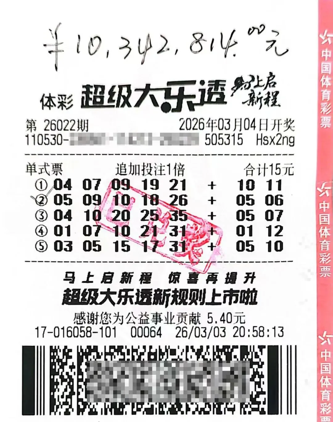 近日,第26022期超级大乐透开奖,去云南丽江旅游的购彩者周先生(化姓)喜中一等奖,奖金1034万元。