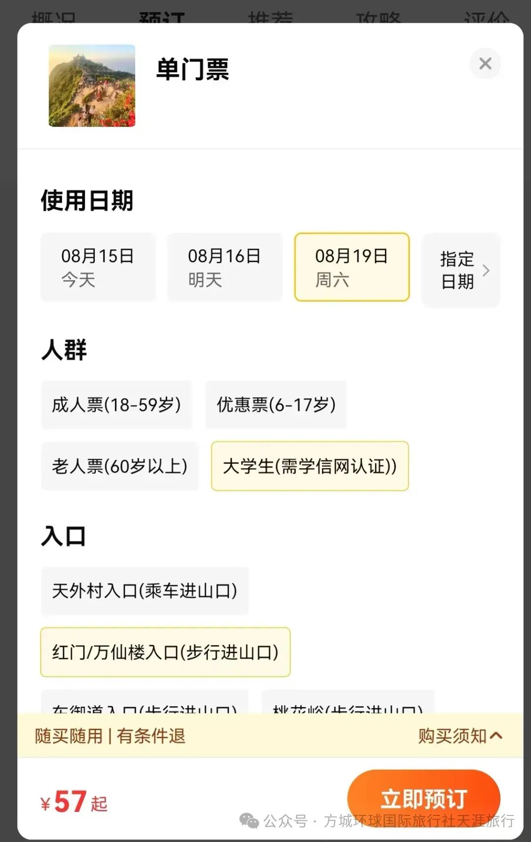 大学生限制学生证且年龄18周岁(含)--23周岁(含)(按生日计算)57元/人