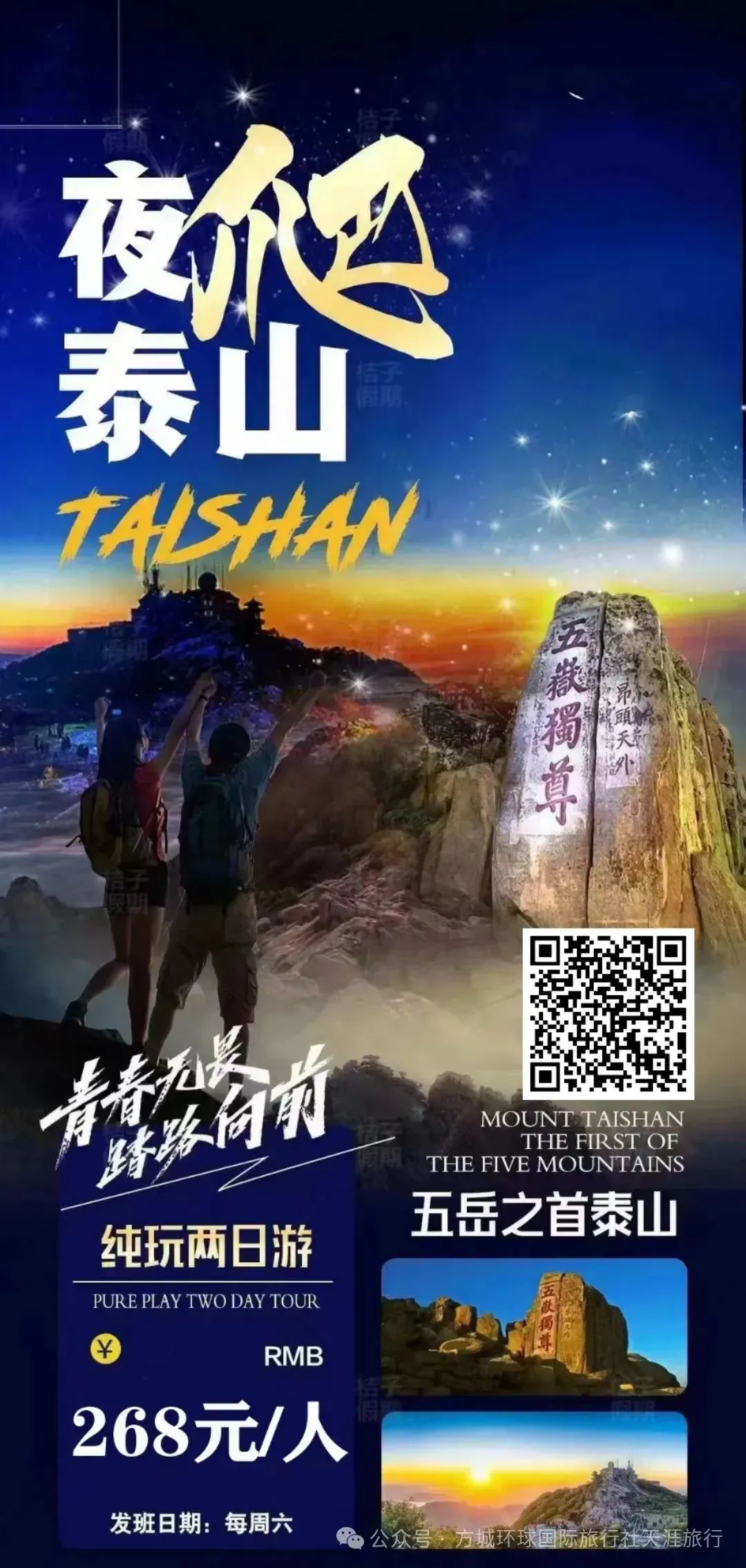 早上登山,不含住宿,客人自行选择夜爬或者凌晨5点,红门——中天门——十八盘——南天门——五岳独尊石头——玉皇顶,从前山下山(感受皇帝当年的朝圣线路云步桥、五大夫松、迎客松、经十八盘等);游览结束后适时集合返程,愉快行程结束。