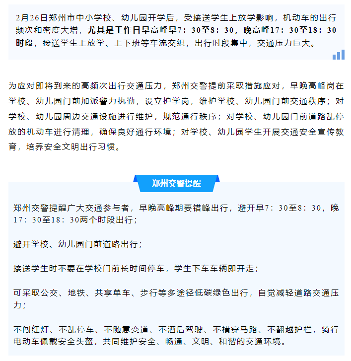 从2月26日开始,郑州市中小学校将开学,市区交通流量将大增,郑州交警提醒广大交通参与者错峰出行。