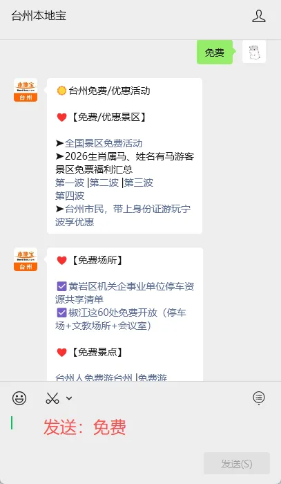 小编有话说:扫描下方二维码,关注【台州本地宝】微信公众号,微信对话框回复【免费】,可获取全国景区免费活动、台州免费场所、景点等
