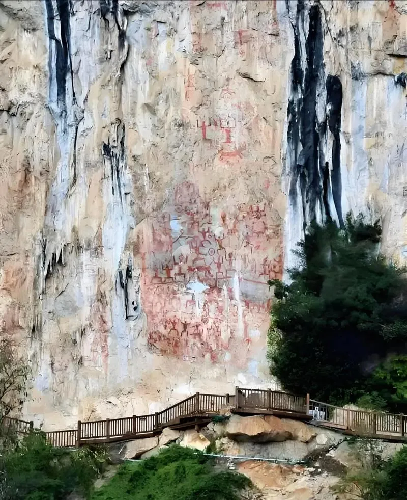 花山岩画得坐船去看,画在江边的悬崖上,距离水面几十米,全是用赭红色颜料画的人形,密密麻麻的,有两千多年了,考古学家到现在都没完全搞清楚这些画是怎么画上去的,因为那个位置根本够不着,也不知道当年的人用的什么工具。站在船上看这些画,会有种很强烈的时间感,就是你现在看见的这些线条,是两千多年前有人专门爬上去,用不知道什么办法画在那的,他们当时想说什么,想记录什么,你现在看着这些简单的人形,其实什么都不知道,但你知道这件事发生过,而且它一直在那,江水涨了退,退了涨,这些画就一直在崖壁上看着。