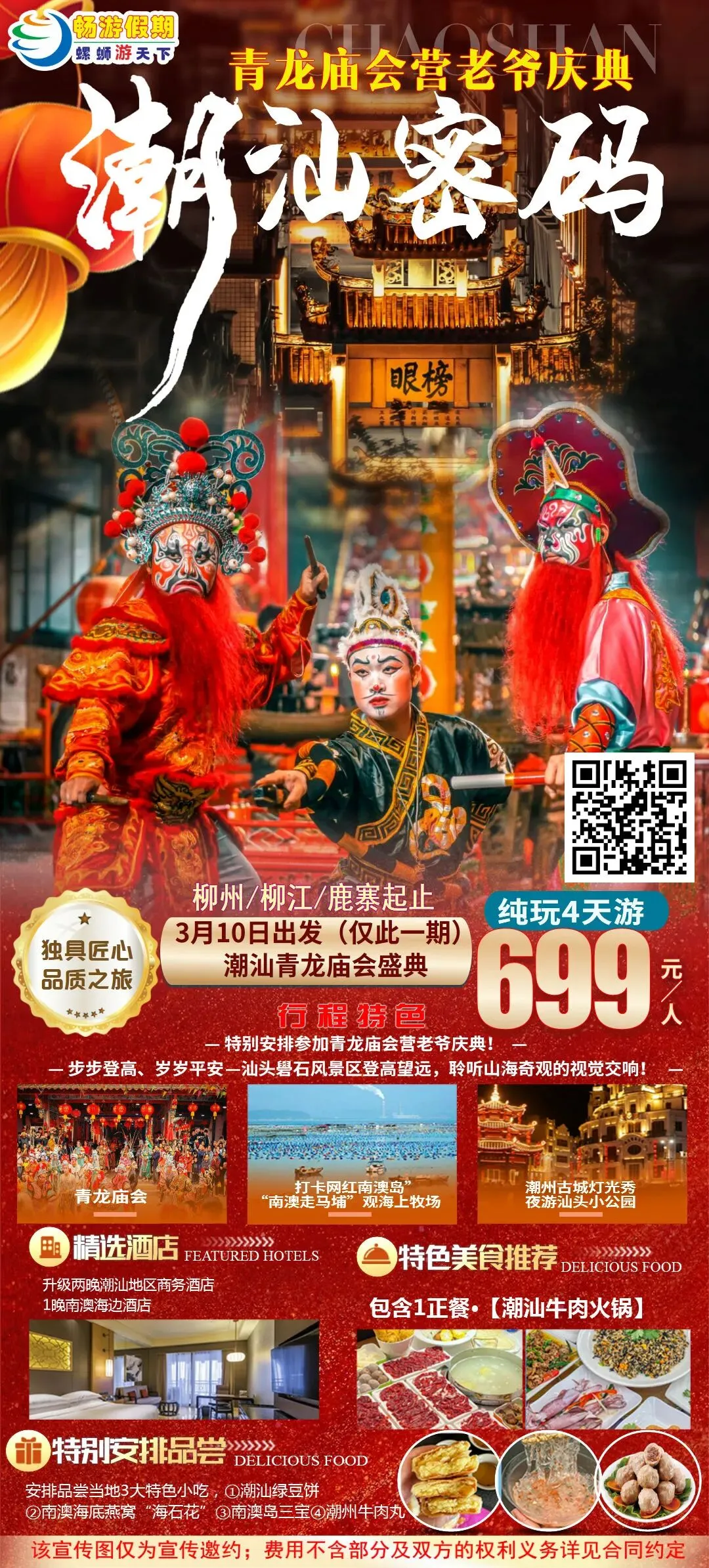 3月10日成团🈶位‼️仅此一期‼️【潮汕密码·青龙庙会盛典】揭阳古城,网红双峰寺夜景+潮汕古城+汕头南澳岛+湘子桥灯光秀四日游,699元/人