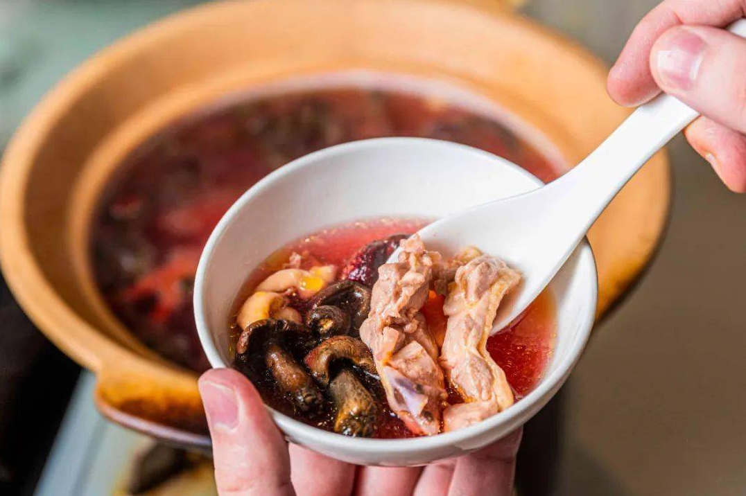 我给他盛了一碗汤,舀了几块鸡肉和红蘑菇递给他。