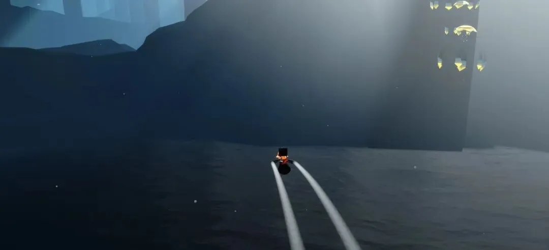 咱接着往前游动就行,算是大地图的右前方,这步目的主要是去那个水面下边有实体建模方便放椅子的地方,这里如果乱了方向可以飞起来往下看,会明显有一块水域是深色的,去那里就行,这是咱落水就得注意了,因为如果潜水下去会触底传送,不过这个不是很危险(下边可活动空间也很大)就是了。