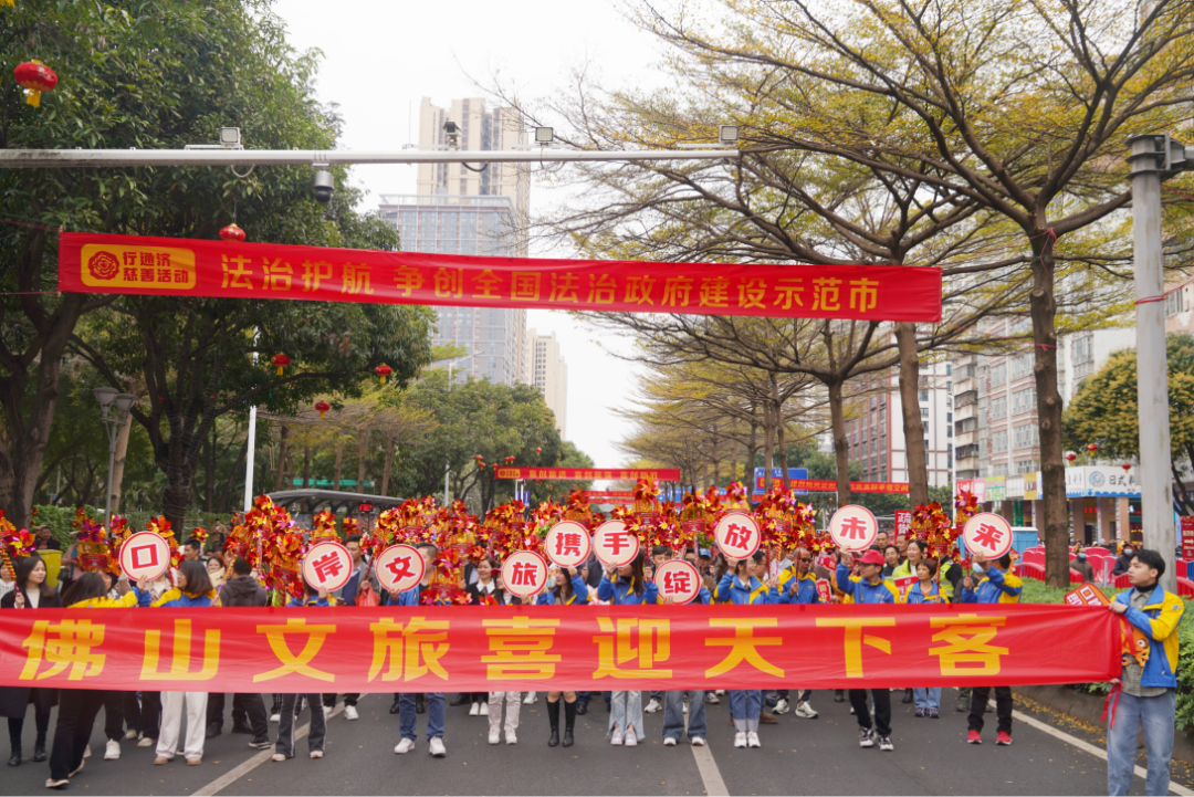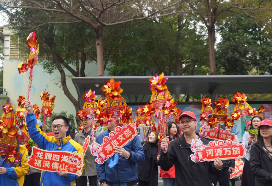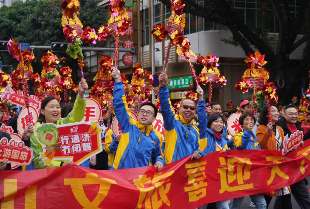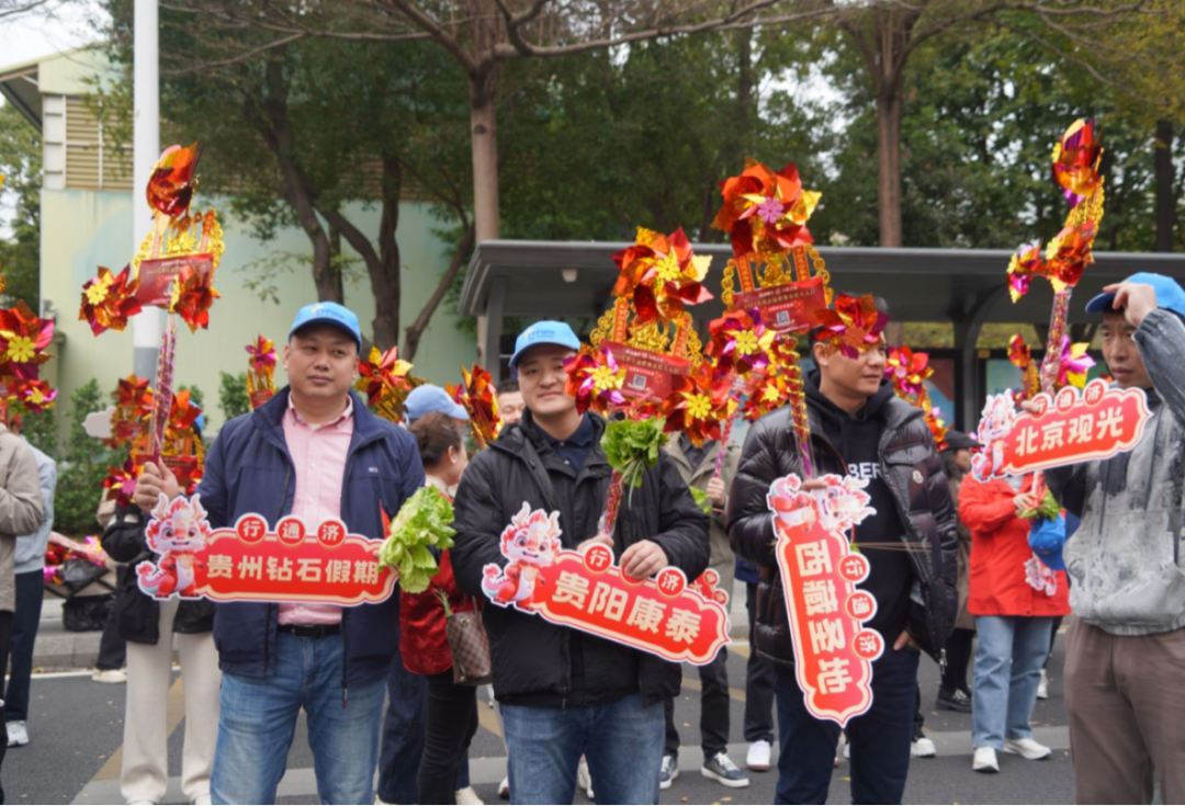 方阵里的“文舞春秋行通济,龙旅天下韵山河”横幅,“全国文旅聚佛山”“龙腾四海 福满佛山”“2024 向好运靠‘龍’”等龙年特色祝福标语成为巡游活动的显眼包,形成一道独特、充满活力的风景线。