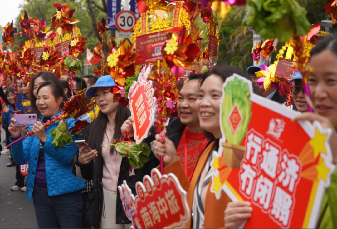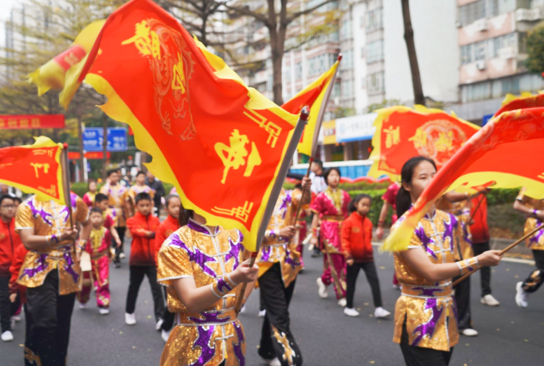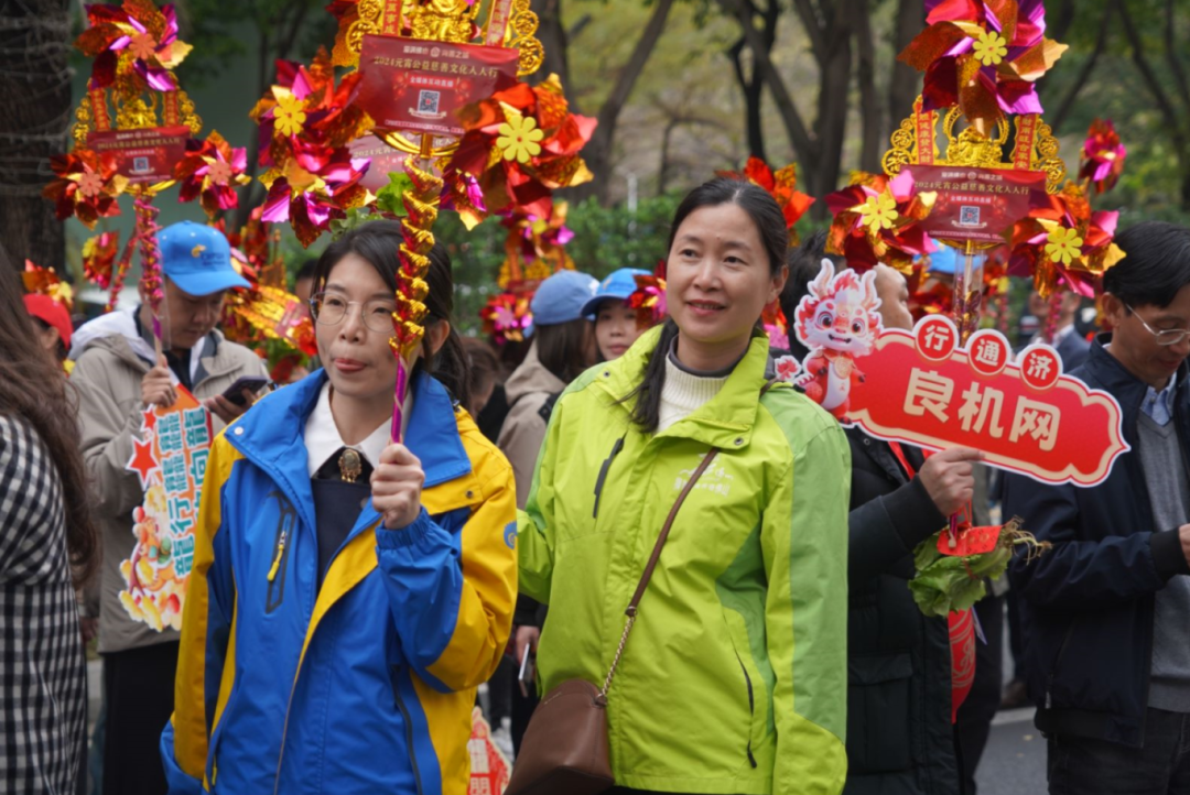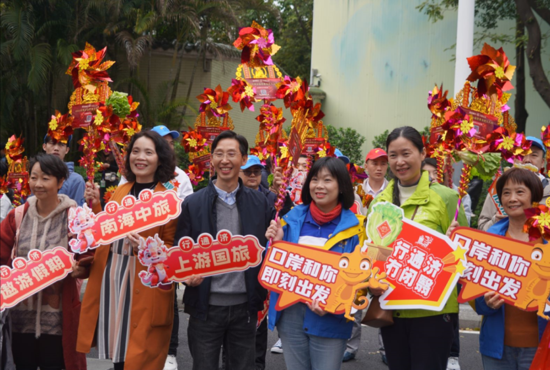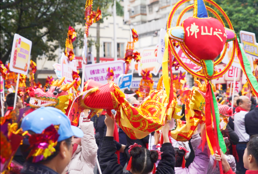 方阵里的“文舞春秋行通济,龙旅天下韵山河”横幅,“全国文旅聚佛山”“龙腾四海 福满佛山”“2024 向好运靠‘龍’”等龙年特色祝福标语成为巡游活动的显眼包,形成一道独特、充满活力的风景线。