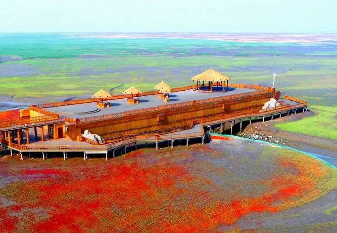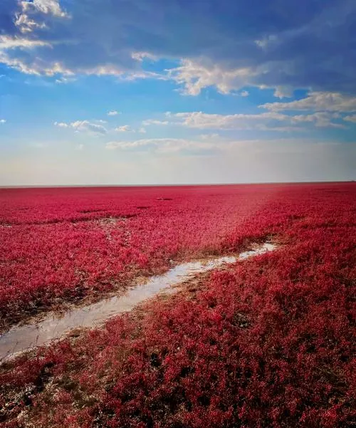 很多人第一次听说红海滩,以为是海滩红了,或者是沙子红了,这个理解不算错但也不够准确,因为红海滩这个地方,红的不是沙子,是一种叫碱蓬草的植物,每年四月发芽,九十月份最红,整片整片地铺在滩涂上,远看就像是海边燃起了一片火焰,这种景象在国内其他地方基本看不到,不是因为别的地方没有碱蓬草,而是因为能把碱蓬草长成这么大规模、这么纯粹的红色、同时还能让人走进去看的地方,只有盘锦这一片。