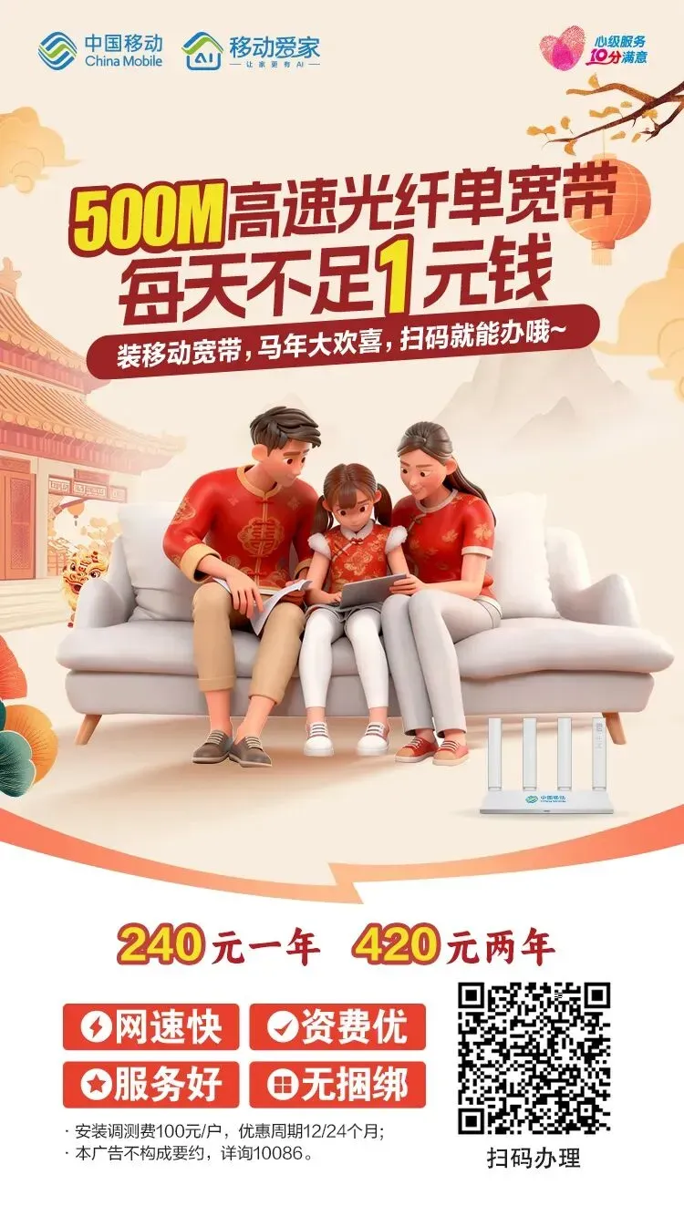 依托移动优质网络,信号覆盖广、连接稳,偏远地区也能畅享,让您的新家与职场始终在线。