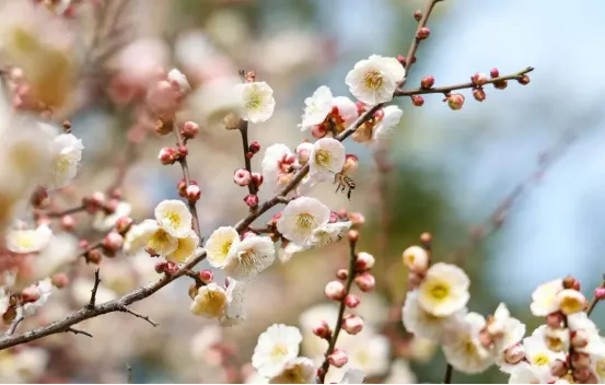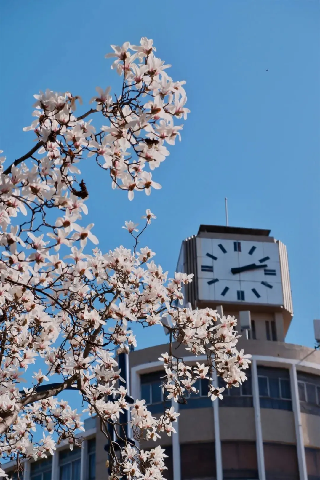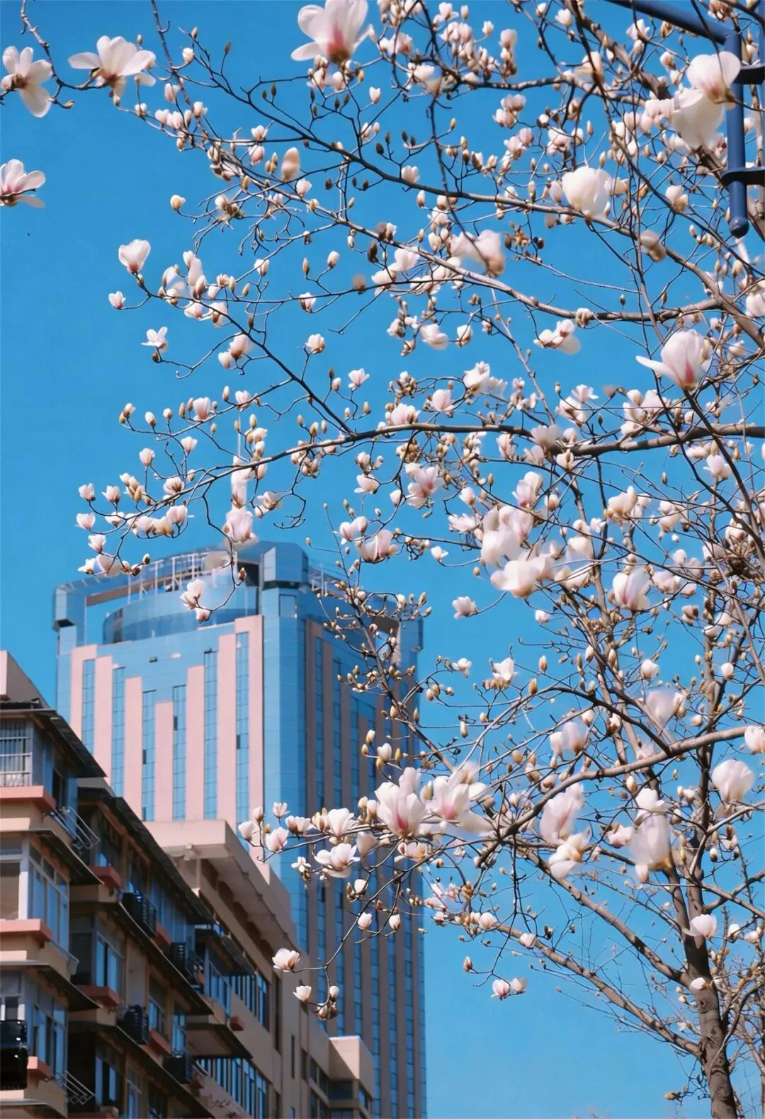 此刻,萧山大钟楼前的玉兰亭亭而立;湘湖边的美人梅正值盛期,粉紫的花朵缀满枝头,如烟如霞;湘湖早樱一开,春风吹过樱花一落,肩上便落满了纷扬的春雪。等过些日子,海棠垂着头,温柔得惹人怜爱;山阴路的桃花即将“粉墨登场”;湘湖边的木绣球一团团一簇簇……