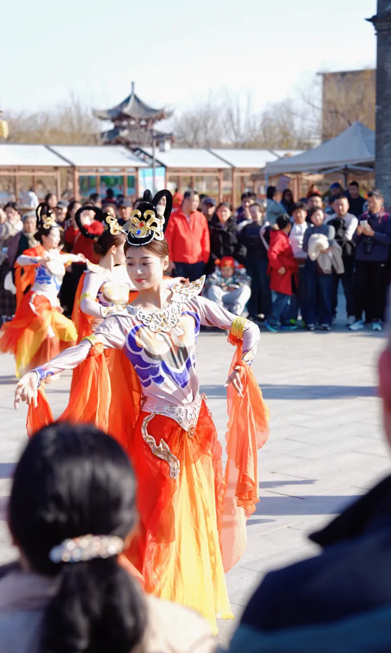 逛累了,停下来歇一歇。看舞者们水袖轻扬,舞姿翩跹。背景是巍峨的铁塔,眼前是流动的宋韵风华。