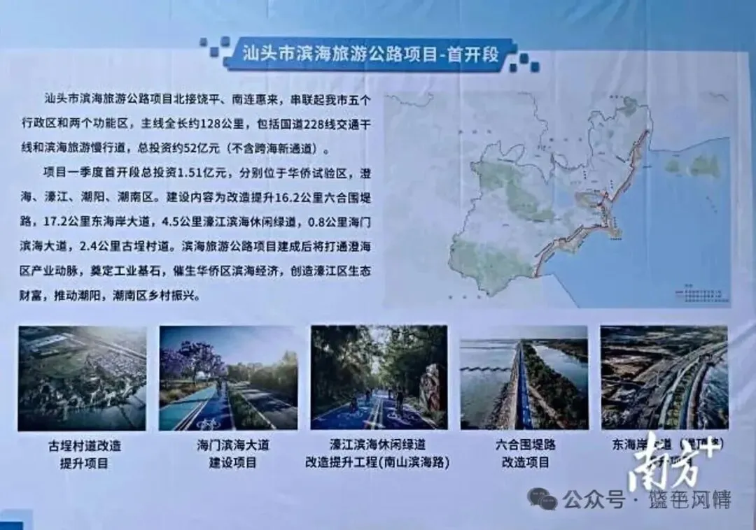 据悉,该项目北接饶平、南连惠来,串联起汕头市五个行政区和两个功能区,主线全长约128公里,包括国道228线交通干线和滨海旅游慢行道,总投资约52亿元(不含跨海新通道)。