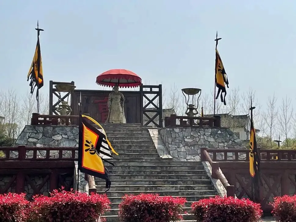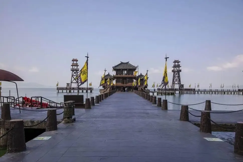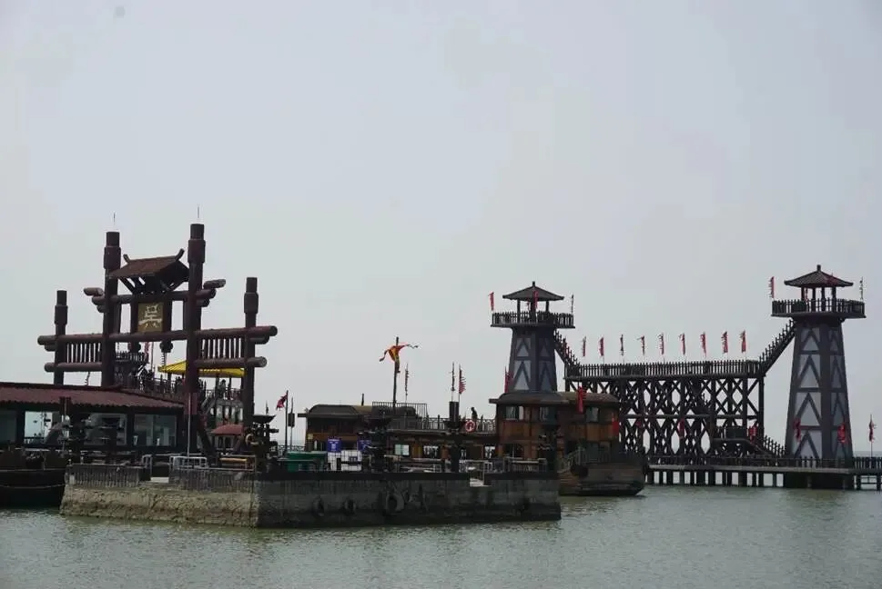 这里就是规模庞大的“曹军水旱寨”,这座水旱寨由曹操点将台、辕门、四座敌楼和楼船组成,是《三国演义》中“火烧赤壁”、“横槊赋诗”、“草船借箭”等戏的拍摄所在。